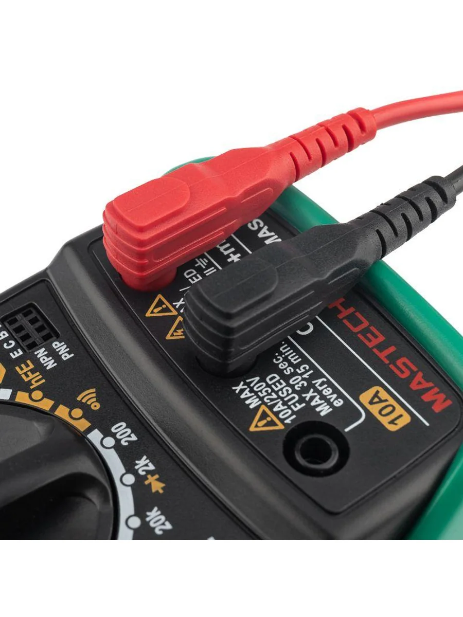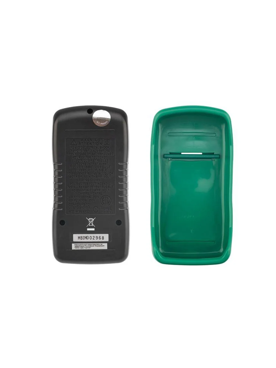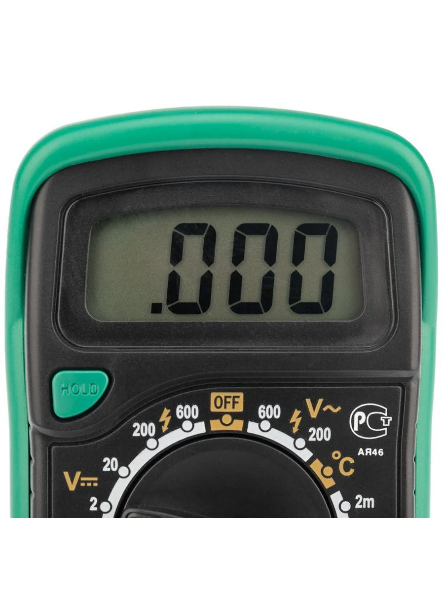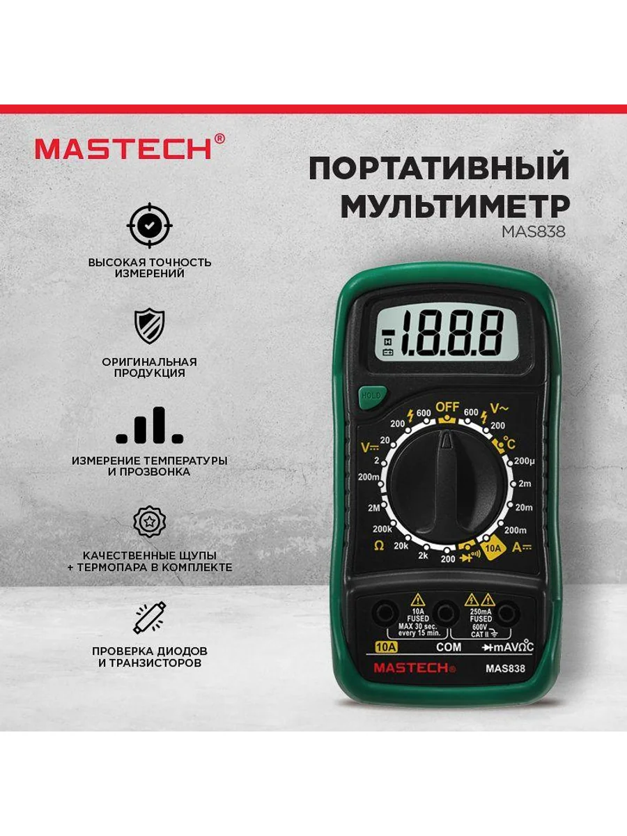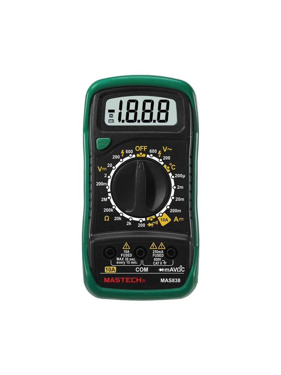 Портативный мультиметр MASTECH MAS838 – прибор, который измеряет постоянное и переменное напряжение, постоянный ток, сопротивление в цепи, температуру. С помощью данного устройства можно проводить тестирование диодов и прозвонку целостности цепи. Прибор оснащен функцией удержания результата измерений DATA HOLD: используется в случае проведения работ в труднодоступных местах. Поворотный регулятор для выбора измеряемых величин и их пределов усилен для исключения возможности случайного нажатия. Мультиметр укомплектован термопарой «К»-типа, измерительными щупами, батареей и руководством по эксплуатации. Прибор изготовлен из высококачественных материалов, калибровка и тестирование приборов произведены под контролем компании СДС. Характеристики: Постоянное напряжение: 200 mВ/2 В/20 м/200 В (±0.5% +3), 600 В (±0.8% +5) Переменное напряжение: 200 В/600 В (±1.2% +10) Постоянный ток: 20 мкА/200 мкА/2 мА/20 мА/200 мА (±1.0% +3), 10 A (±3.0% +10) Сопротивление: 200 Ом/2 КОм/20 КОм/200 КОм (±0,8% +2), 2 МОм (±1,0% +5) Температура: –20...+1000 °С (±2.0% +2) Тестирование диодов: да Прозвонка целостности цепи: да Импеданс: <50 Ом Рабочая температура: 0...+40 °С Размер: 138х69х31 мм Тип батареи: 9 В «Крона» Принадлежности: устройство, комплект измерительных щупов, батарея 9 В, термопара «К»-типа, инструкция и упаковка Преимущества: Режим удержания измерений DATA HOLD Индикация разряда батареи Ручной выбор предела измерений 4-разрядный дисплей Небольшой вес