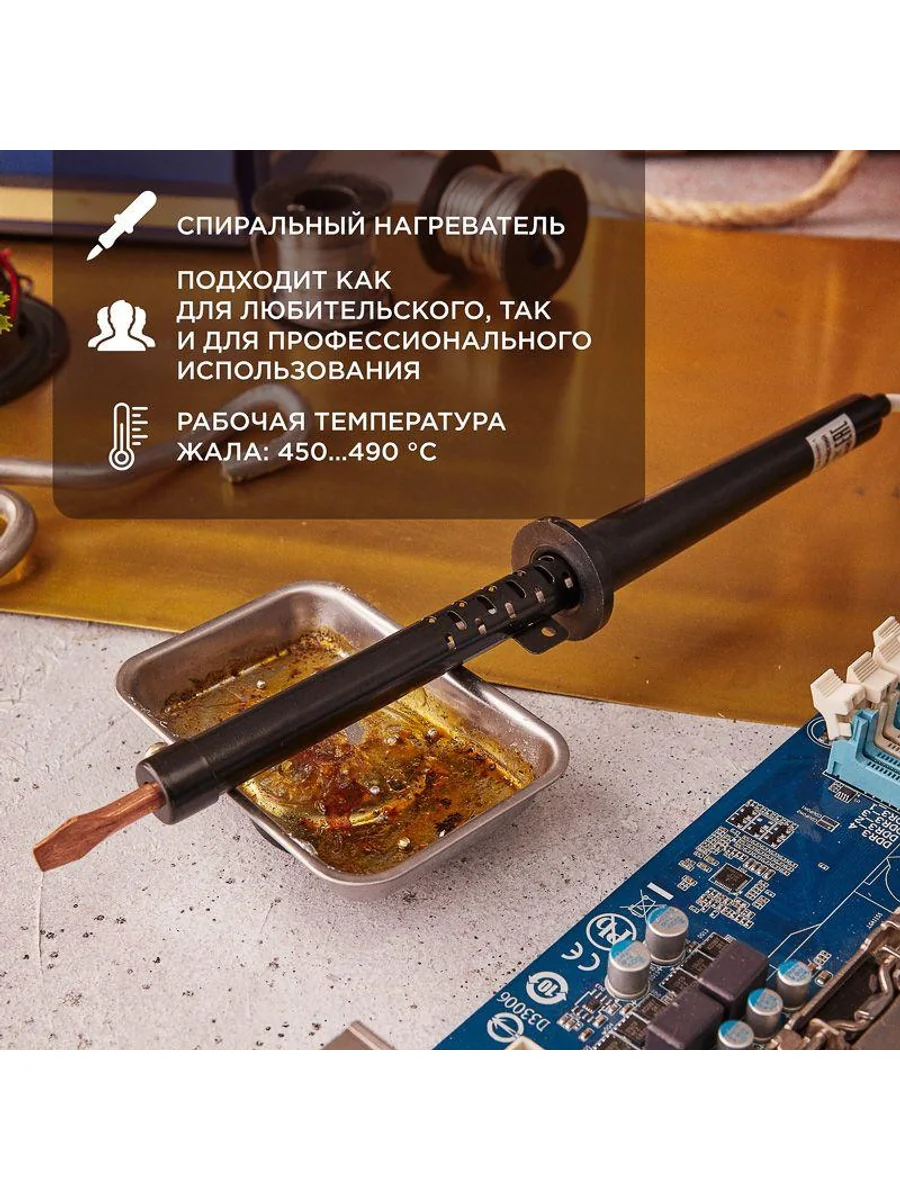 Паяльник с пластиковой ручкой серии ЭПСН мощностью 65Вт REXANT предназначен для ручного монтажа/демонтажа электронных компонентов и других деталей среднего размера. Подходит как для любительского, так и для профессионального использования. Медное жало выполнено в форме клина (лопатки), в случае необходимости его можно легко и быстро заменить (сменное жало в комплект не входит). Удобная рукоятка выполнена из термостойкого пластика.