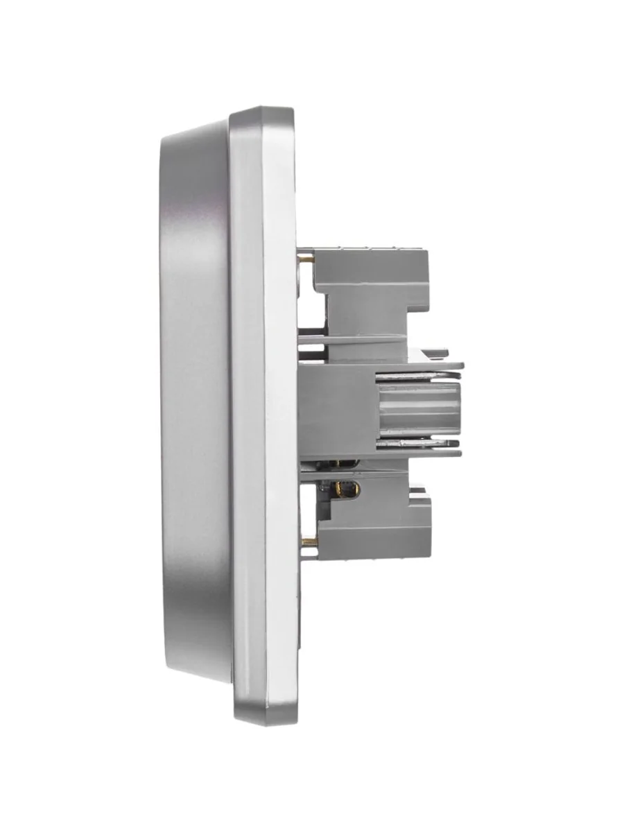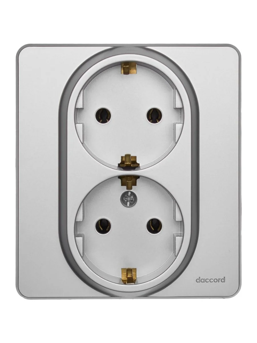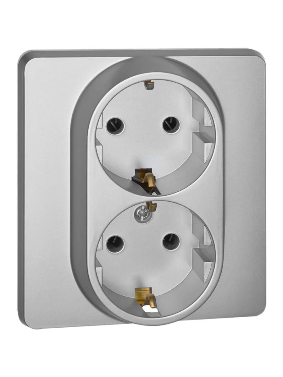 Розетка двойная с заземлением для скрытого монтажа Inspiria, цвет "Алюминий", максимальный ток 16А, напряжение ~250В, максимальная мощность 3680Вт, винтовые зажимы. Применяется для присоединения однофазных электрических потребителей к сети переменного тока в зданиях с проводкой с заземлением (с защитным проводником). Позволяет компактно разместить две розетки в одном установочном месте.