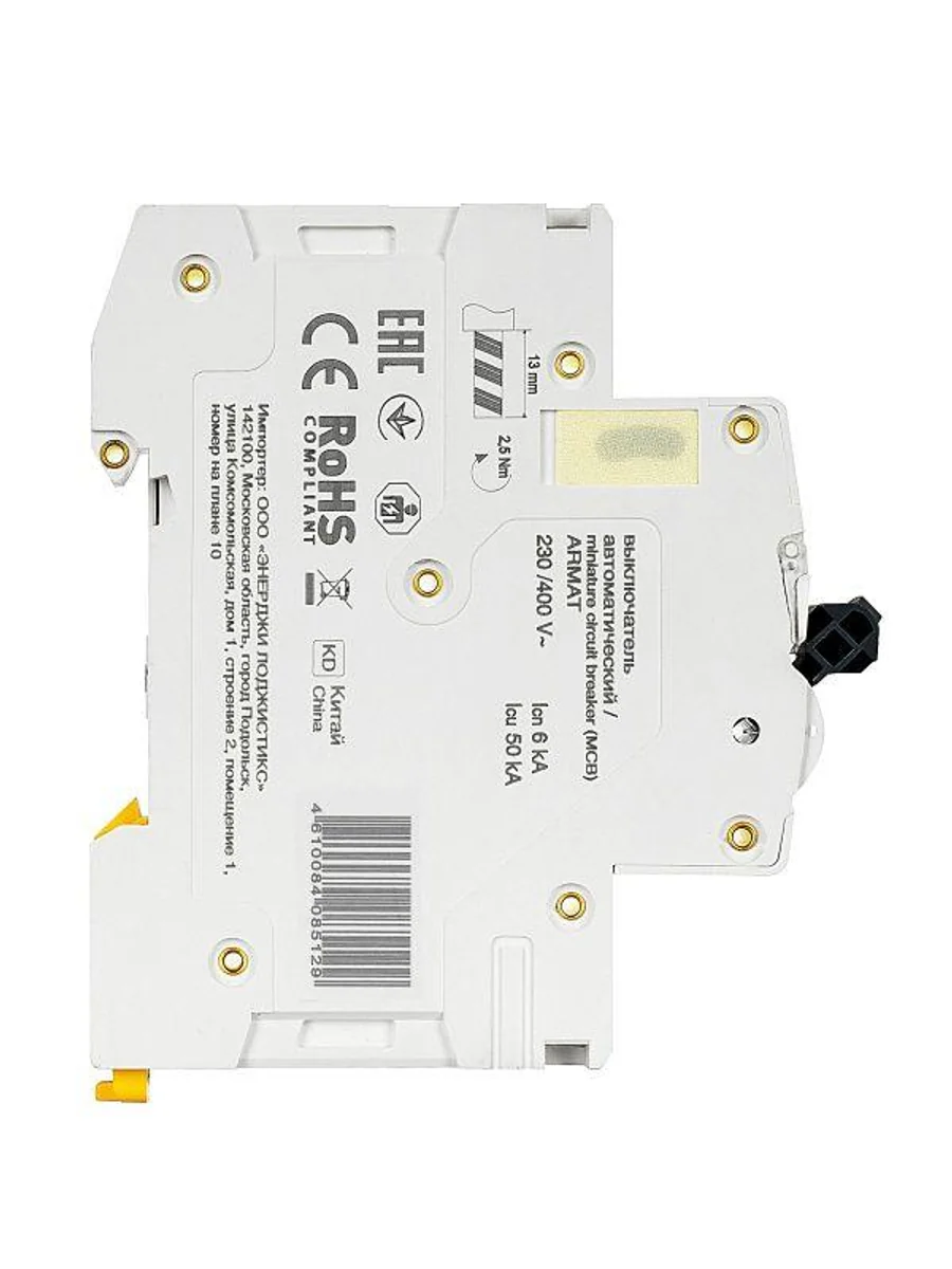 Автоматические выключатели ARMAT серии M06N предназначены для защиты цепей от перегрузки и короткого замыкания. Модельный ряд включает в себя устройства с характеристиками срабатывания B, C, D и номинальными токами от 0,5 до 63 А. Номинальная отключающая способность автоматических выключателей ARMAT серии M06N составляет 6 кА. Предельная отключающая способность варьируется в зависимости от номинала от 10 до 50 кА.