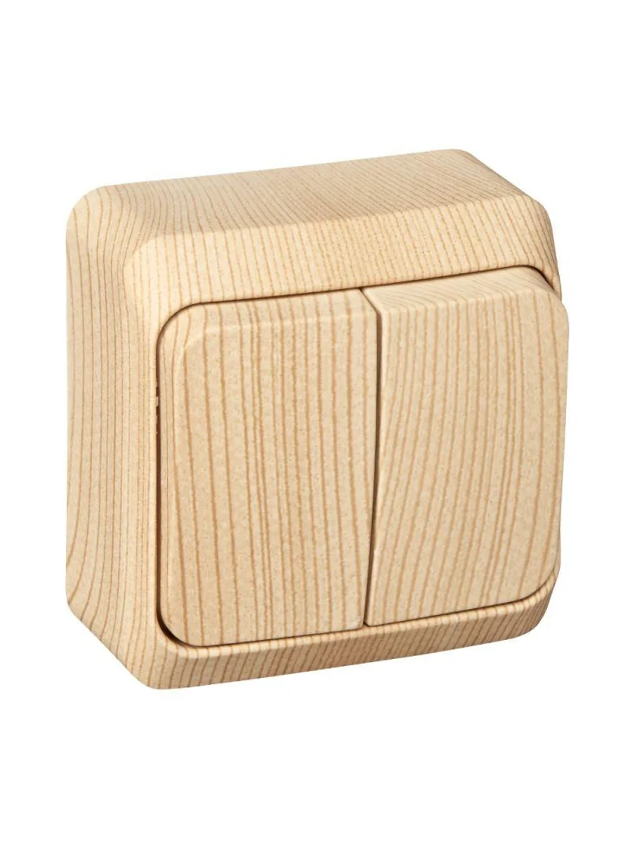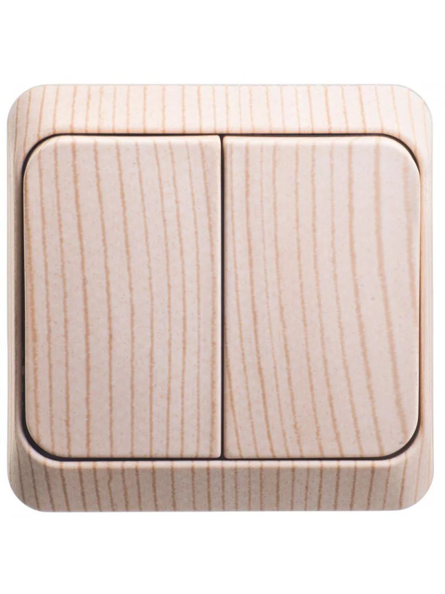 Выключатель Systeme Electric (ранее Schneider Electric) ЭТЮД (сосна, открытой установки) двухклавишный предназначен для применения в сетях до 250В, на ток до 10А. Наличие подсветки делает его легко находимым при отсутствии освещения. Две клавиши позволяют управлять двумя источниками света с одной точки. Изделия цвета Сосна обладают уникальным рисунком, напоминающим древесный сруб. Сделано в России.