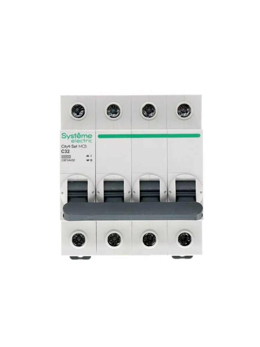 Автоматический выключатель серии City9 Set Systeme Electric, 4-полюсный, номинальный ток 32 А, характеристика С, Icn = 4.5 кА. Применяется в электрических сетях напряжением 400 В. Предназначен для защиты от перегрузок и токов короткого замыкания. Оснащен механизмом «мгновенной коммутации». Ударопрочный корпус из специального пластика с 6 металлическими заклепками. Безопасные клеммы исключают попадание кабелей в заклеммное пространство (ранее Schneider Electric EZ9F34432).
