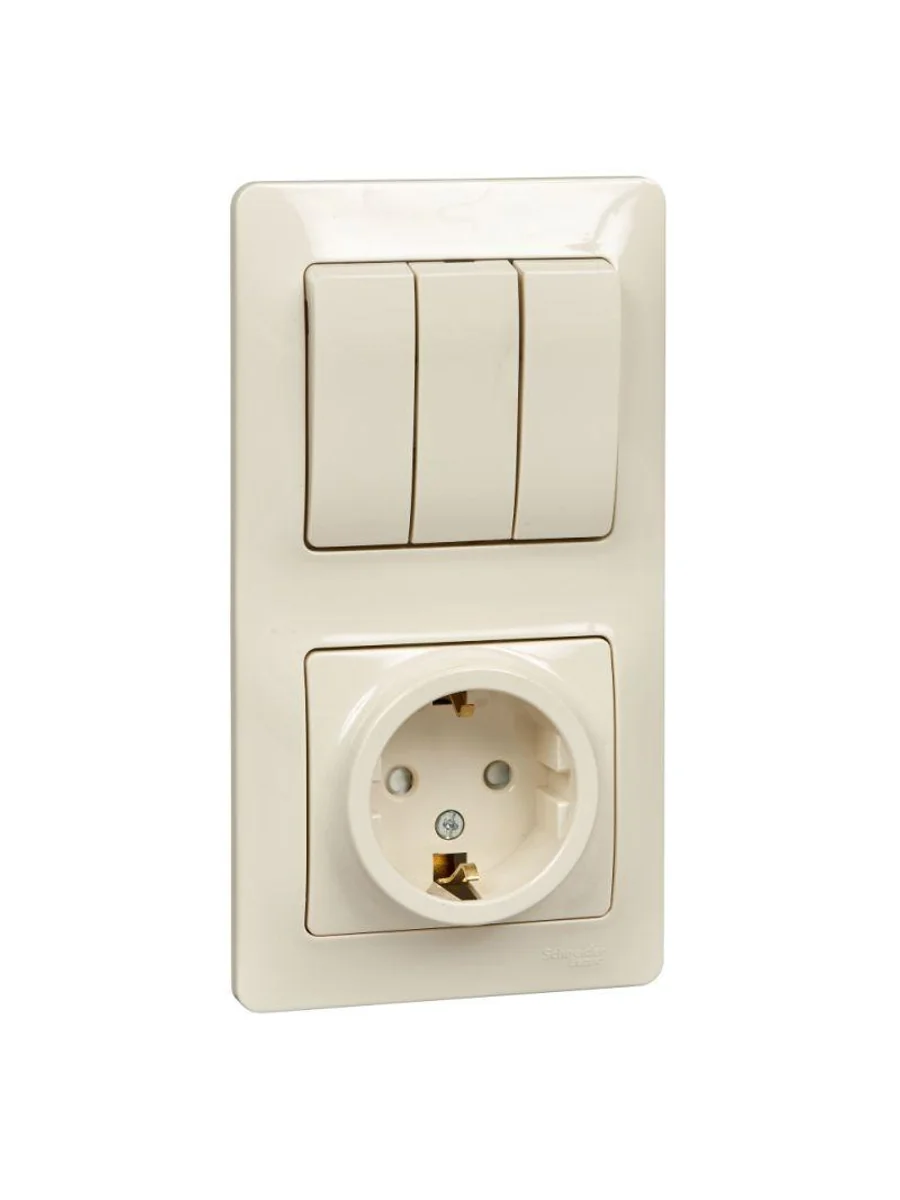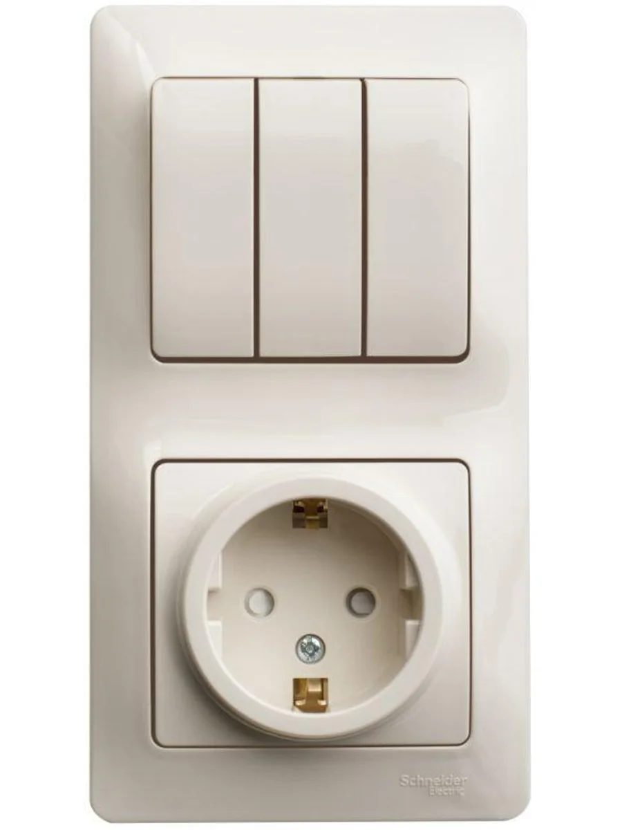 Блок комбинированный Systeme Electric (ранее Schneider Electric) серии Glossa (в сборе, цвет бежевый) предназначен для сетей до 250 В, состоит из розетки с заземлением и шторками на 16 А и 3-клавишного выключателя на 10 А. - Блок удобен в применении и отлично подходит для коридора. - Заземляющий контакт обеспечивает дополнительную защиту от удара электрическим током. При наличии заземления электрический потенциал уходит в землю, защищая человека. - Трёхклавишный выключатель позволяет управлять тремя источниками света из одной точки. - Выполнен из материала PС+ASA, стойкого к УФ-излучению и появлению царапин.