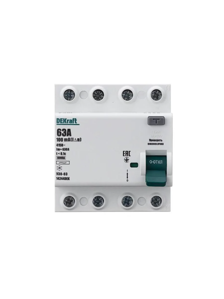 Выключатель дифференциального тока серии УЗО-03 Dekraft; 4P; номинальный ток 63 А; ном.дифф. ток 100 мА; электромеханический; тип дифференциального расцепителя - AC; на DIN-рейку. ВДТ устанавливаются в сетях напряжением до 400 В пер.тока. ВДТ применяются для защиты электроустановок от риска возникновения пожаров вследствие утечек тока. Конструкция устройств позволяет эксплуатировать их даже при низкой температуре. При сборке выключатель дифференциального тока (ВДТ) и автоматический выключатель (для защиты ВДТ) устанавливаются последовательно, при этом номинальный ток аппарата должен быть на одну ступень выше — т. е. 20А при установке последовательно с автоматом на 16А, 32А при установке с автоматом на 25А.