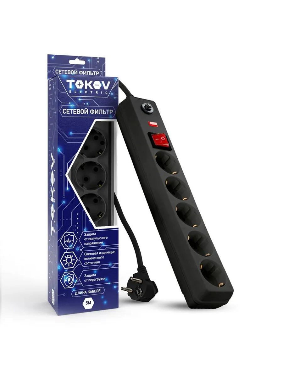 Удлинитель с сетевым фильтром 5х5м с заземл. с выкл. 16А с защ. от скачков напр. и перегрузок 3х1 черн. TOKOV ELECTRIC TKE-C05-SF5-5-ZV - купить в KeepBuilding | KeepBuilding