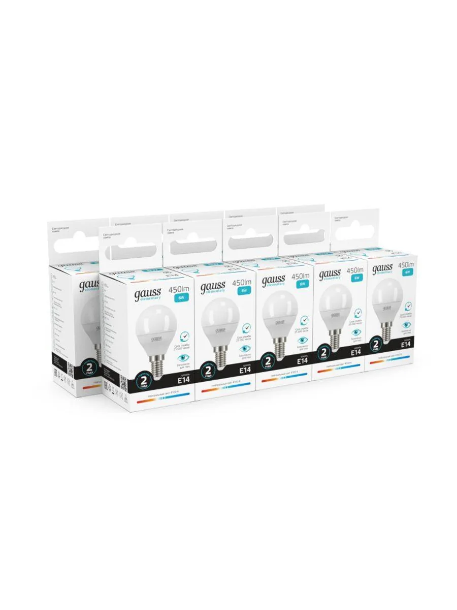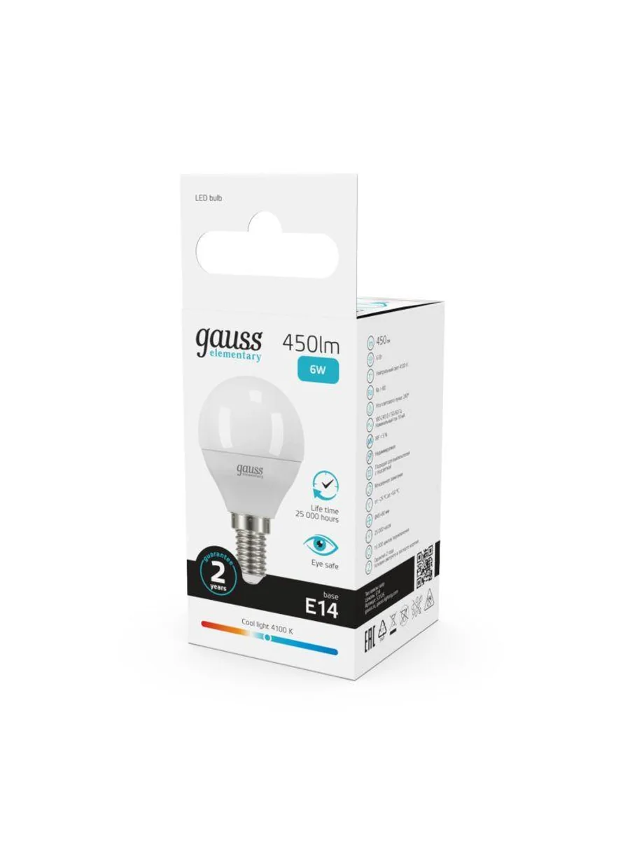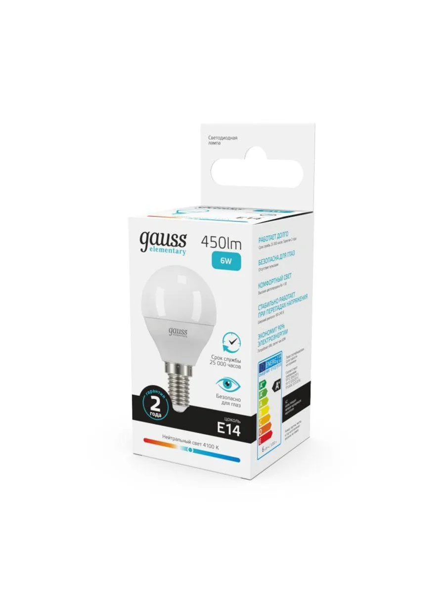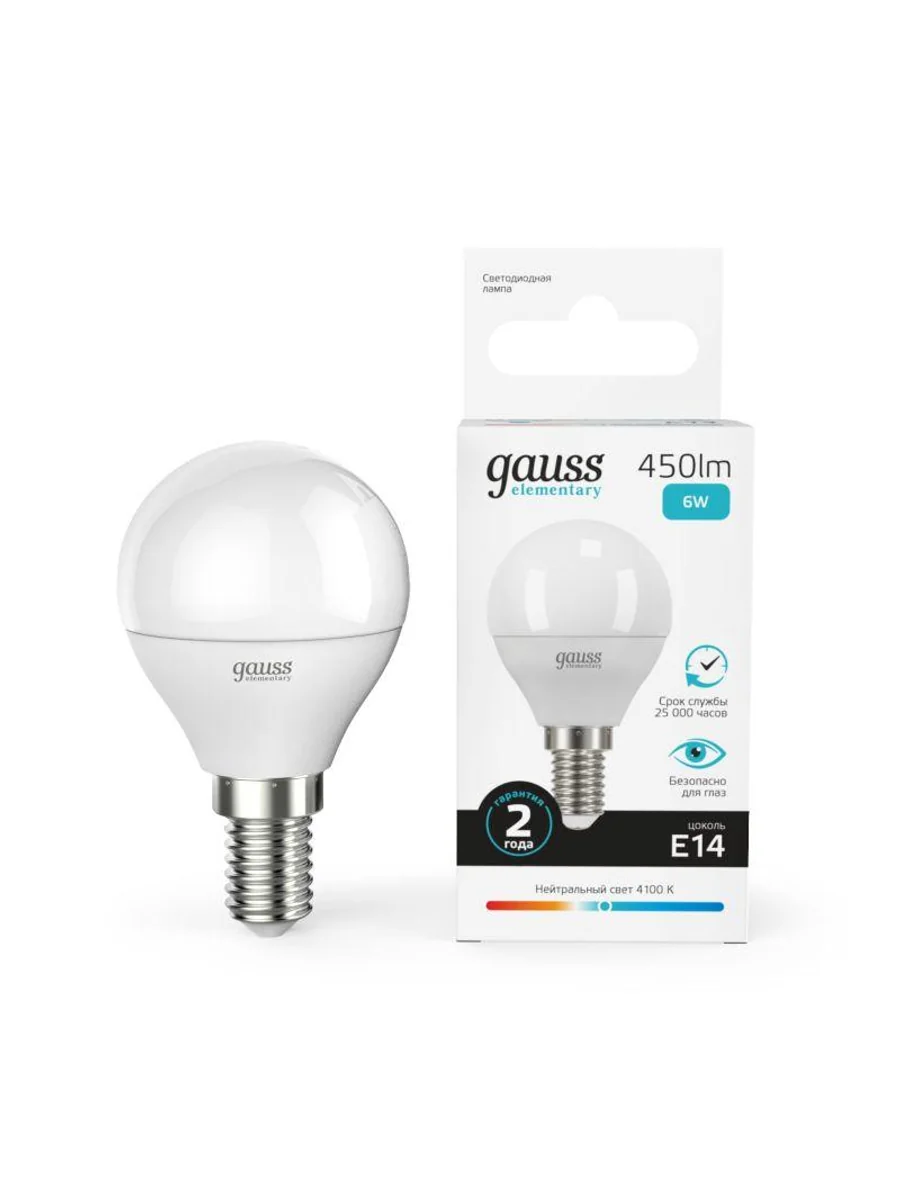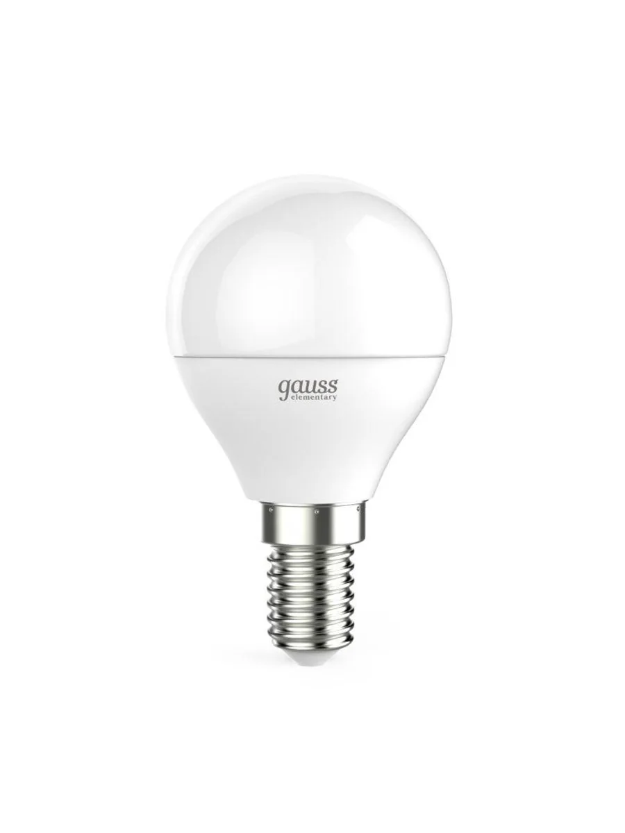 Лампа светодиодная LED Elementary Globe 6Вт E14 4100К Gauss 53126 – лампа с колбой вида "шар", белого света, длиной 87 мм, диаметром 45 мм, с цоколем Е14, мощностью 6 Вт. Цветовая температура 4100 К.