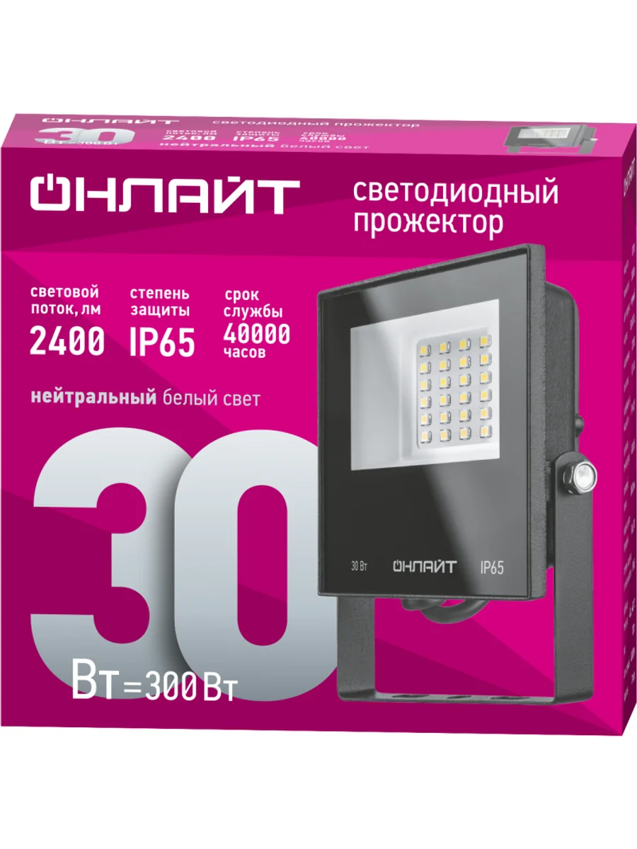 Прожектор 71 657 OFL-30-4K-BL-IP65-LED LED 30Вт IP65 4000К ОНЛАЙТ 19197 является аналогом галогенного прожектора мощностью 300 Вт. Корпус и рефлектор изготовлены из алюминиевого сплава. Рекомендуется к применению как средство наружного освещения (дворов и придомовых территорий, билбордов, стендов), так и внутреннего освещения, в помещении, для освещения витрин, залов, галерей, складов, гаражей.