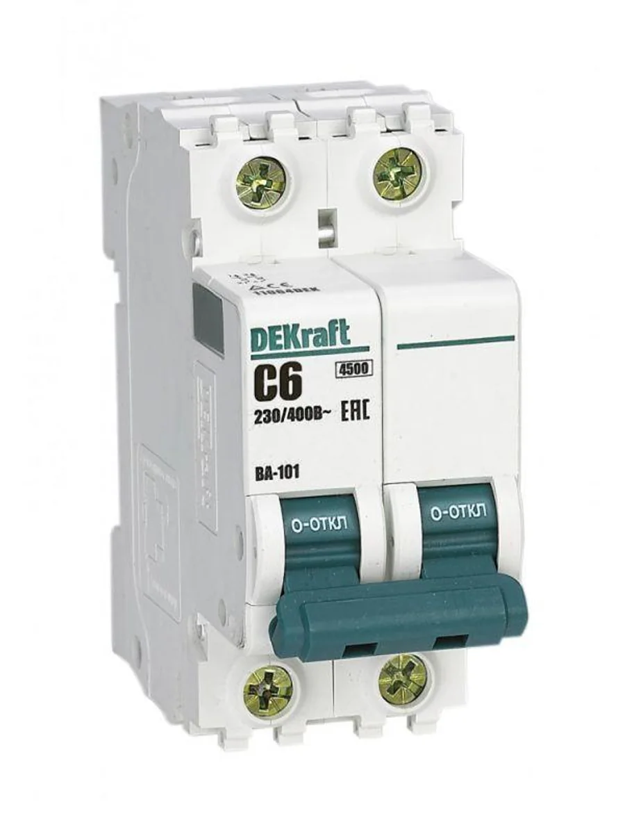 Автоматический выключатель серии ВА-101 Dekraft; 2P; номинальный ток 6 А; характеристика С; отключающая способность 4,5 кА. 5 монолитных заклепок повышают прочность корпуса аппарата. Сплошная лицевая панель обеспечивает безопасность эксплуатации аппарата. Боковые каналы охлаждения повышают стабильность работы при высоких температурах окружающей среды. Есть возможность установки дополнительных аксессуаров с левой стороны устройства. Аппарат на 100% совместим с корпусами Dekraft и Systeme Electric.