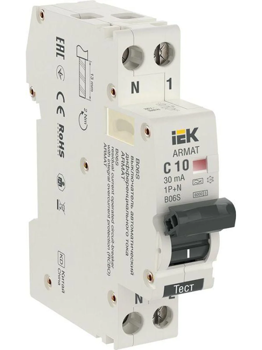 Выключатель автоматический дифференциального тока 2п (1P+N) C 10А 30мА тип A АВДТ B06S 18мм ARMAT IEK AR-B06S-1N-C10A030 - купить в KeepBuilding | KeepBuilding