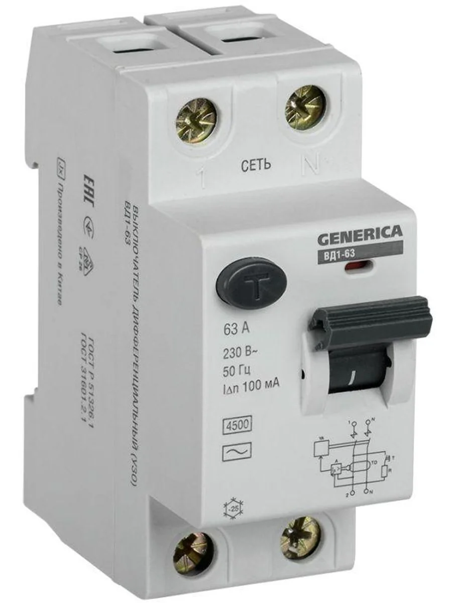 Быстродействующий защитный выключатель ВД1-63 (УЗО) GENERICA - устройство электронного типа, зависящее от напряжения и реагирующее на дифференциальный ток, без встроенной защиты от сверхтоков. Предназначен для защиты человека от поражения электрическим током.