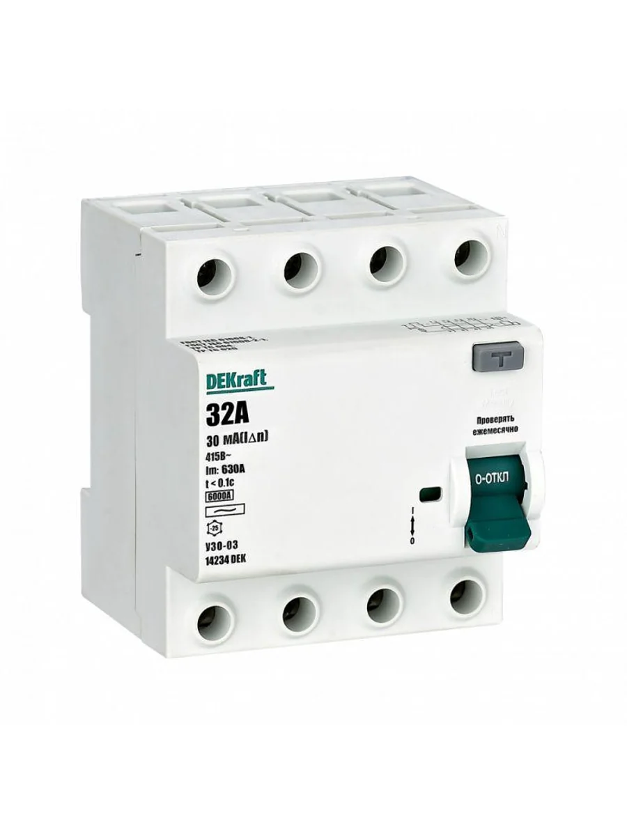 Выключатель дифференциального тока серии УЗО-03 Dekraft; 4P; номинальный ток 32 А; ном.дифф. ток 30 мА; электромеханический; тип дифференциального расцепителя - AC; на DIN-рейку. ВДТ устанавливаются в сетях напряжением до 400 В пер.тока. ВДТ применяются для защиты электроустановок от риска возникновения пожаров вследствие утечек тока. Конструкция устройств позволяет эксплуатировать их даже при низкой температуре. При сборке выключатель дифференциального тока (ВДТ) и автоматический выключатель (для защиты ВДТ) устанавливаются последовательно, при этом номинальный ток аппарата должен быть на одну ступень выше — т. е. 20А при установке последовательно с автоматом на 16А, 32А при установке с автоматом на 25А.