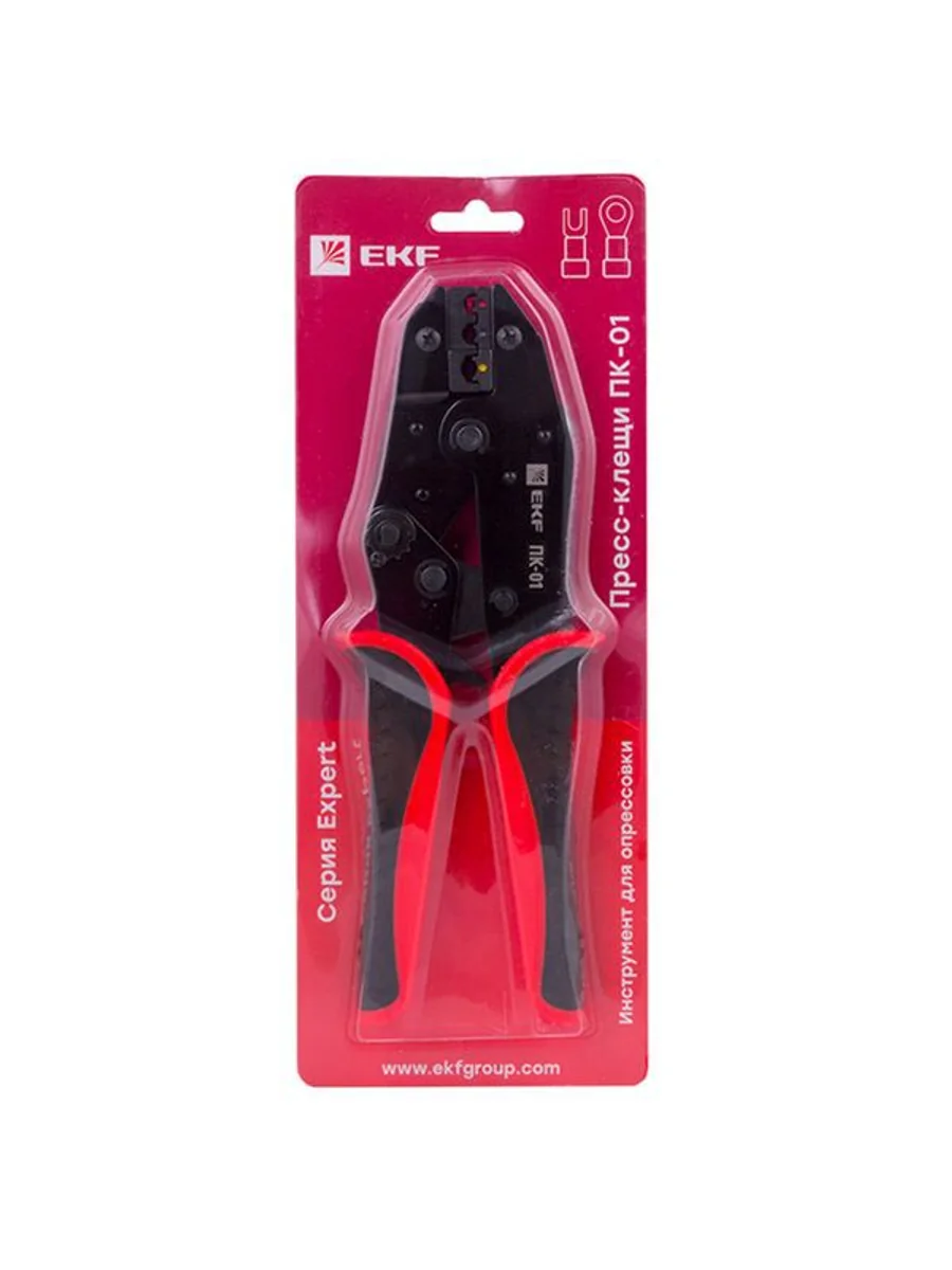 Пресс-клещи pk-01-exp предназначены для НКИ, НВИ наконечников сечением 0,5-6 мм2. Инструмент оснащен храповым механизмом с автоматической разблокировкой по завершению цикла опрессовки. Каждая модель имеет маркировку, указывающую значение сечения используемого наконечника или разъема, а также нанесенную цветовую маркировку, соответствующую цвету изолирующей манжеты. Профиль опрессовки - овал.