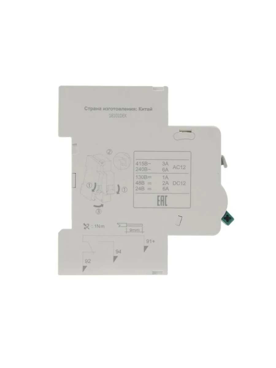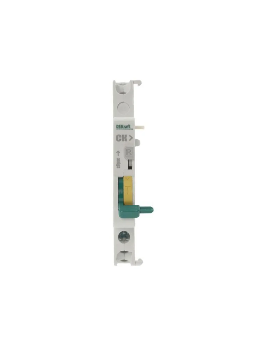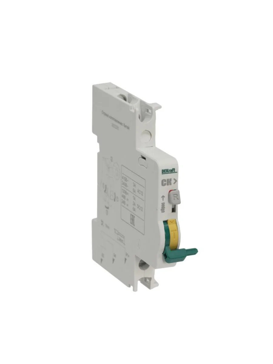 Контакт сигнальный СК-101 для автоматических выключателей серии ВА-101 Dekraft; предназначен для сигнализации аварийного срабатывания выключателя; тип контакта переключающий; ширина 9 мм; присоединение к выключателю слева.
