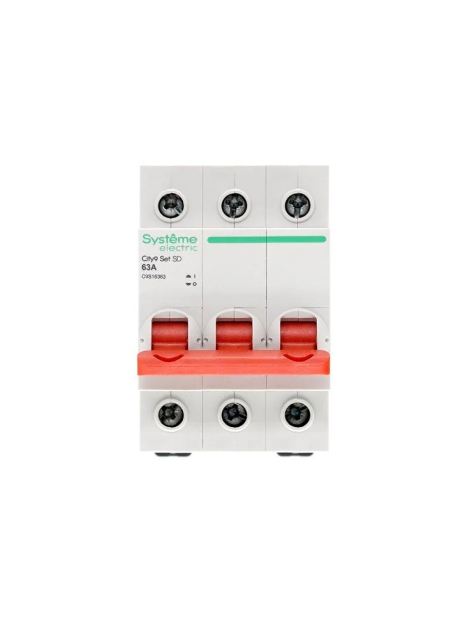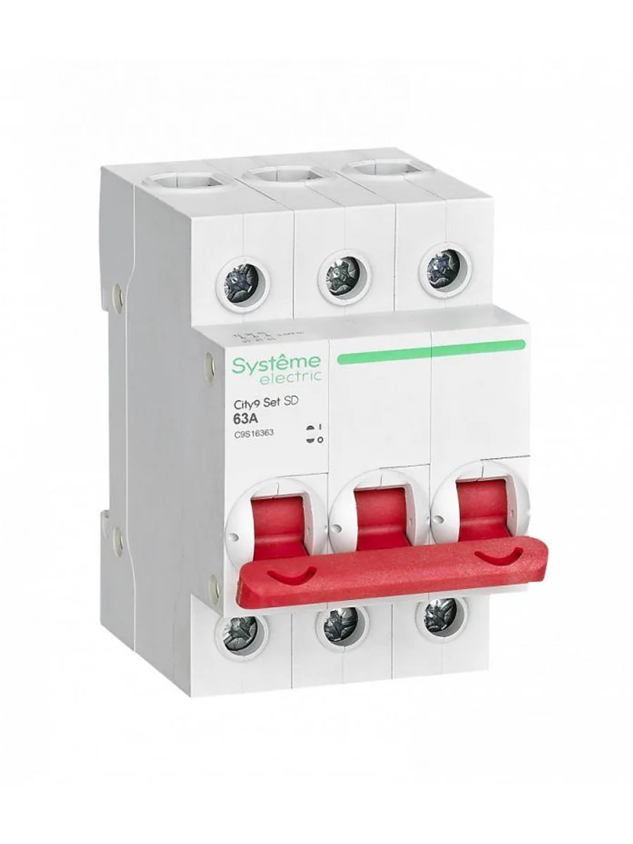 Выключатель-разъединитель серии City9 Set Systeme Electric, 3-полюсный, номинальный ток 63 А, с красной рукояткой управления. Предназначен для включения и отключения нагрузок в электрических сетях напряжением 400 В. Категория применения AC-22A. Двойной разрыв цепи обеспечивает гарантированное отключение питания и отсутствие сваривания контактов. Крепление на DIN-рейку шириной 35 мм. (ранее Schneider Electric A9S65363, EZ9S16363, R9PS363).