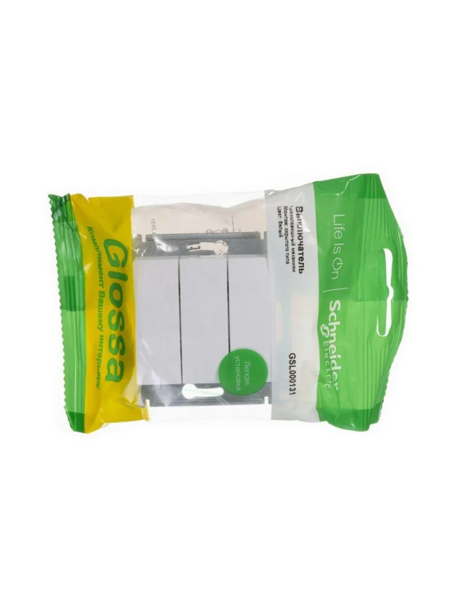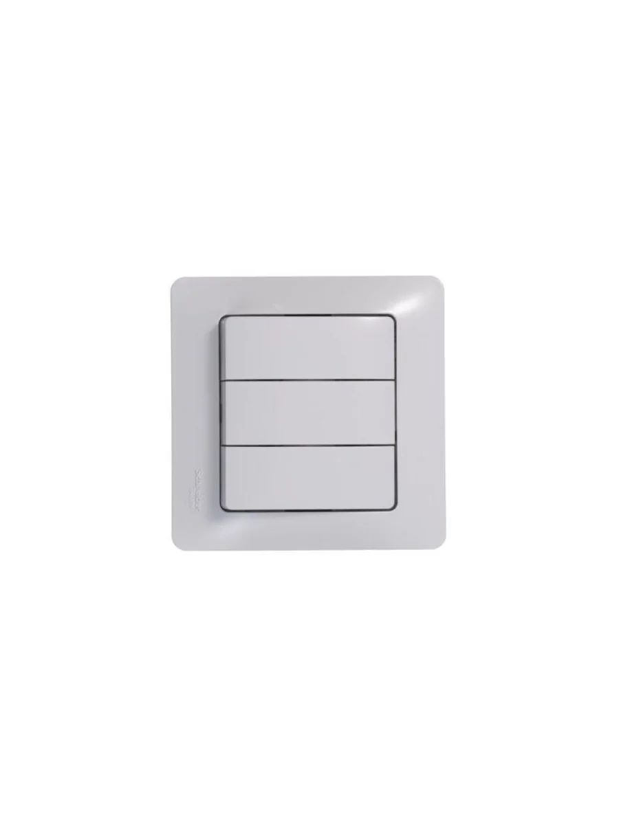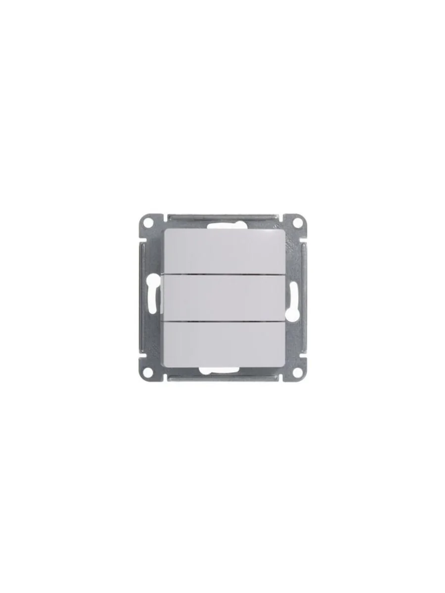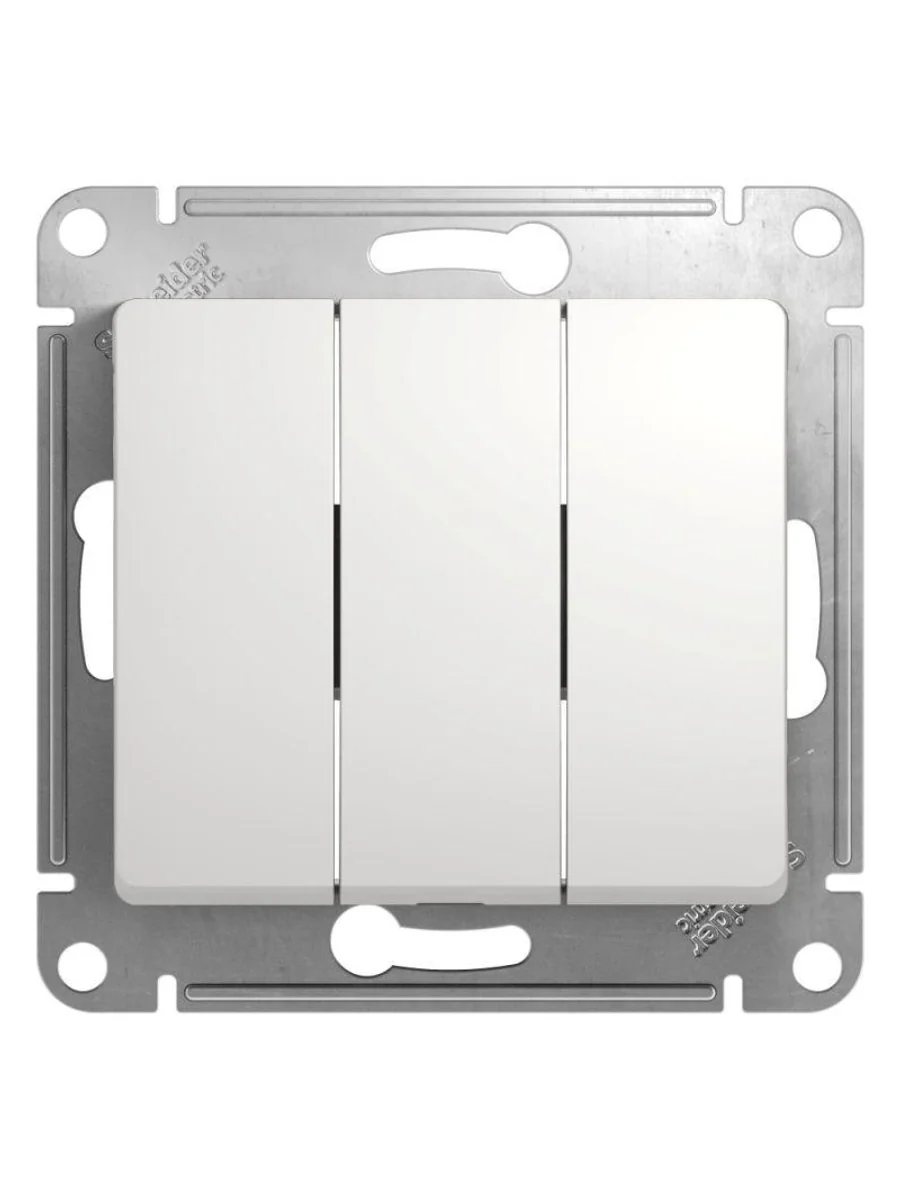Механизм Systeme Electric (ранее Schneider Electric) серии Glossa (цвет белый) выключателя 3-клавишного подходит для сетей 250 В, на ток 10 А. - Трёхклавишный выключатель позволяет управлять тремя источниками света из одной точки. - Выполнен из материала PС+ASA, стойкого к УФ-излучению и появлению царапин. - Эргономичные клеммы расположены в два ряда: сверху и снизу.