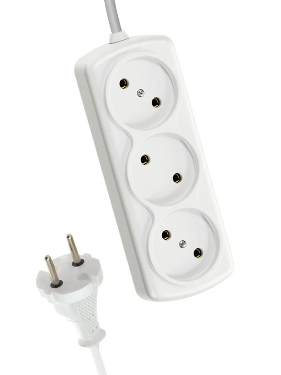 Удлинитель 1300 Вт 1,5м на 3 гнезда – базовая модель для не слишком мощной домашней периферии - настольные лампы, зарядные устройства и др. Вставки на корпусе из негорючего полипропилена, кабель ПВС 2х0,75мм (без заземления). Контактная группа из латуни не деформируется со временем.