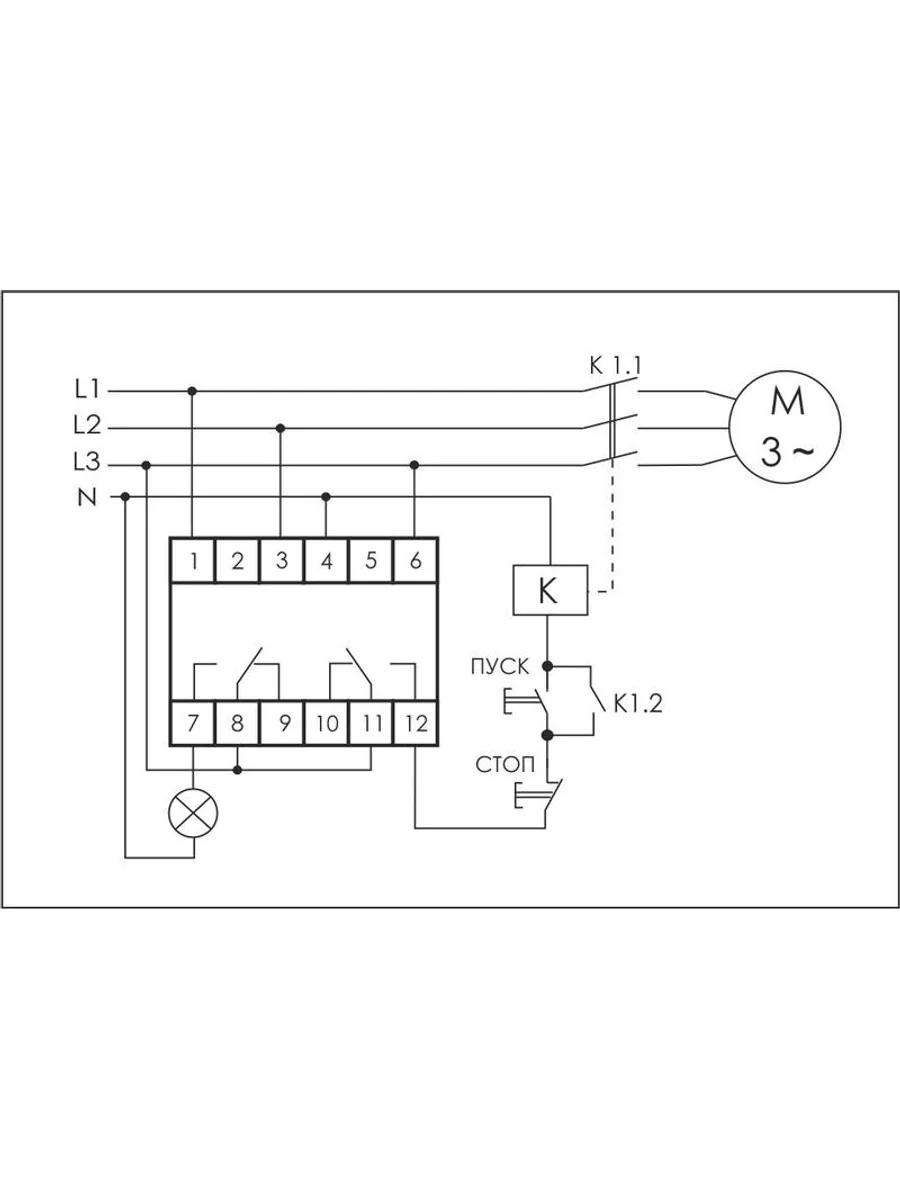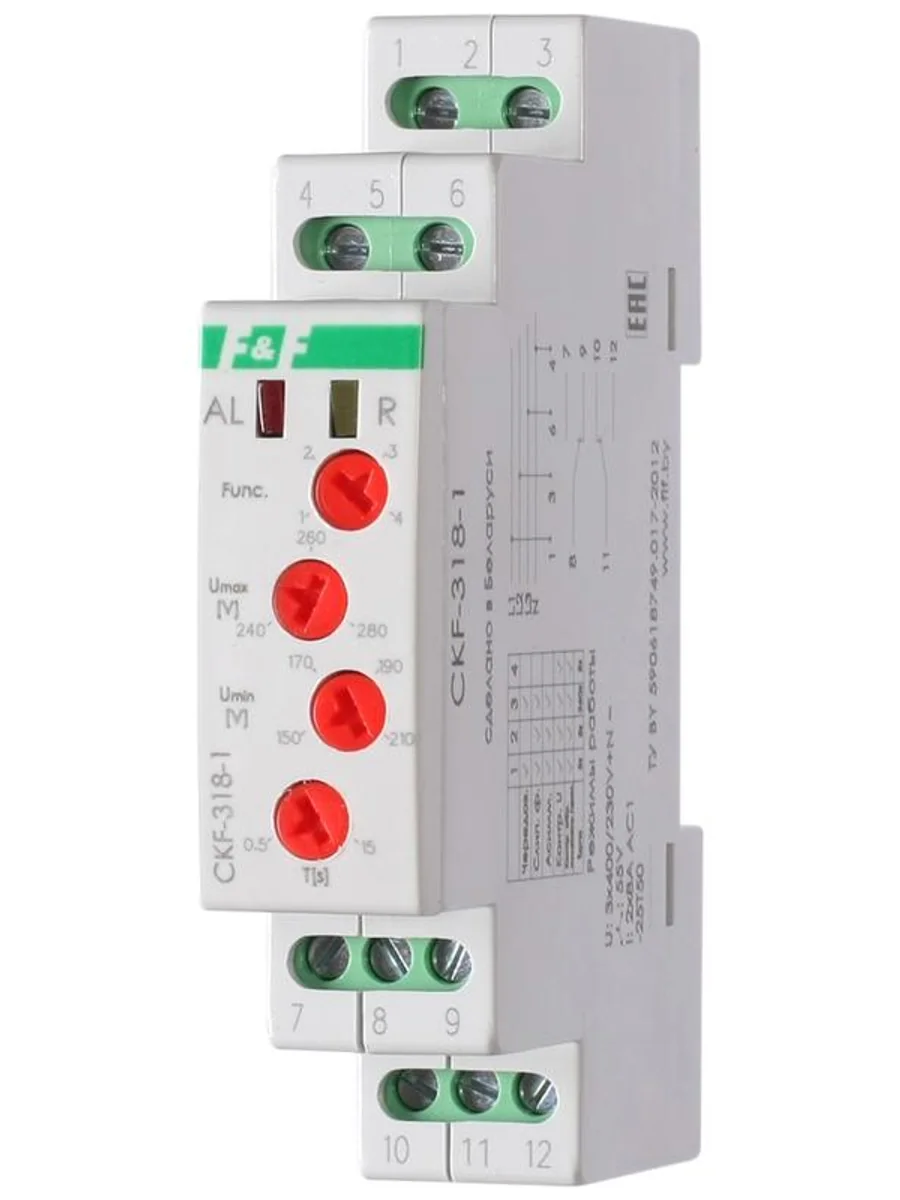 Реле контроля фаз серии "CKF" Монтаж на DIN-рейку. Предназначено для защиты электродвигателей и электроустановок, питаемых от трехфазной сети в случаях: отсутствия хотя бы одной из фаз, асимметрии напряжения, повышения/снижения напряжения, слипания и нарушения чередования фаз, обрыва нулевого провода. Принцип работы Если напряжение в пределах нормы, контакты исполнительного реле замкнуты и на контактор управления электродвигателем подается напряжение, управляющее его включением. В случае одной из вышеперечисленных аварийных ситуаций контакты реле размыкаются и контактор отключается. Включение происходит автоматически после восстановления сетевого напряжения питания. Особенности: контроль наличия фаз; контроль асимметрии между фазами; контроль нижнего значения напряжения; контроль верхнего значения напряжения; контроль слипания и чередования фаз; защита от обрыва нулевого провода; 4 режима работы; напряжение питания 3x230+N В AC; контакт - 2NO/NC (8 А).