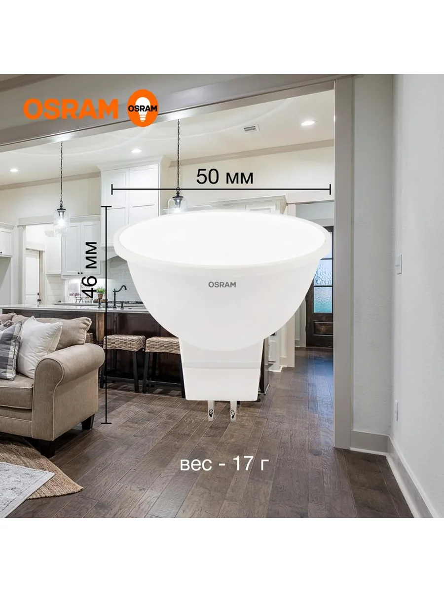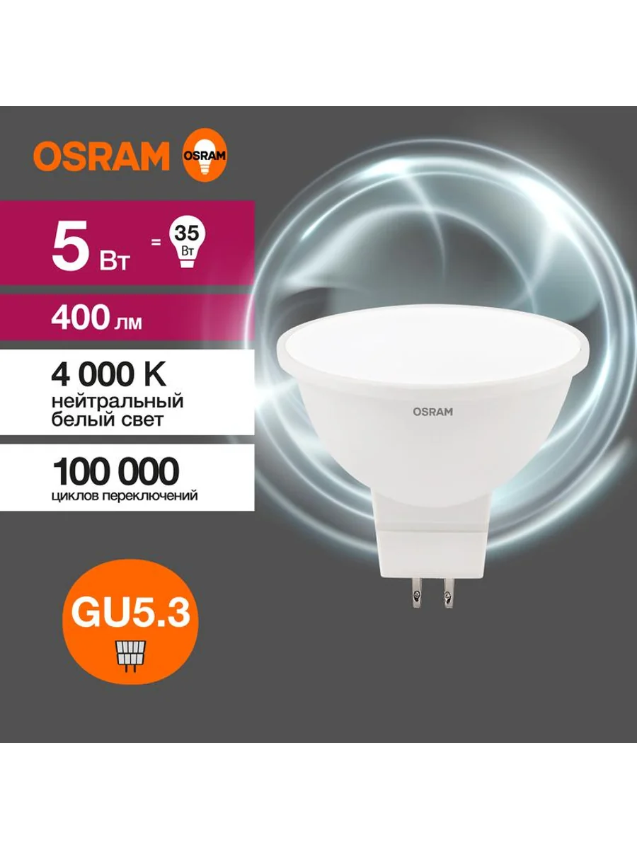 Светодиодные лампы OSRAM - разумная замена традиционным лампам накаливания или галогенным лампам. Светодиодные лампы OSRAM снижают затраты на освещение до 90% при сохранении привычного уровня освещенности. Эта лампа OSRAM серии LED Value выполнена в форме колбы MR16 с цоколем GU5.3. Материал колбы - пластик, исполнение - матовое. Световой поток 400 люмен, что соответствует лампе накаливания на 35 Вт. Подобные лампы (их еще называют споты) используются для внутреннего освещения. Особенно часто их используют для освещения ванных комнат внутри закрытого светильника. Эта лампа излучает нейтральный белый свет, угол пучка - узкий. Качество света на высоте: низкие пульсации защищают глаза, а высокий индекс цветопередачи позволяет видеть мир в его истинном цвете. Кроме того, лампы OSRAM полностью безопасны для здоровья, поскольку в них нет опасных материалов по европейскому стандарту RoHS, а также они не производят вредных электромагнитных излучений, что подтверждено ЭМС (сертификат электромагнитной совместимости). Лампа проработает долго: срок службы - 25000 часов, 2 года гарантии. Светодиодные лампы OSRAM - умный выбор для здоровья семьи и кошелька!