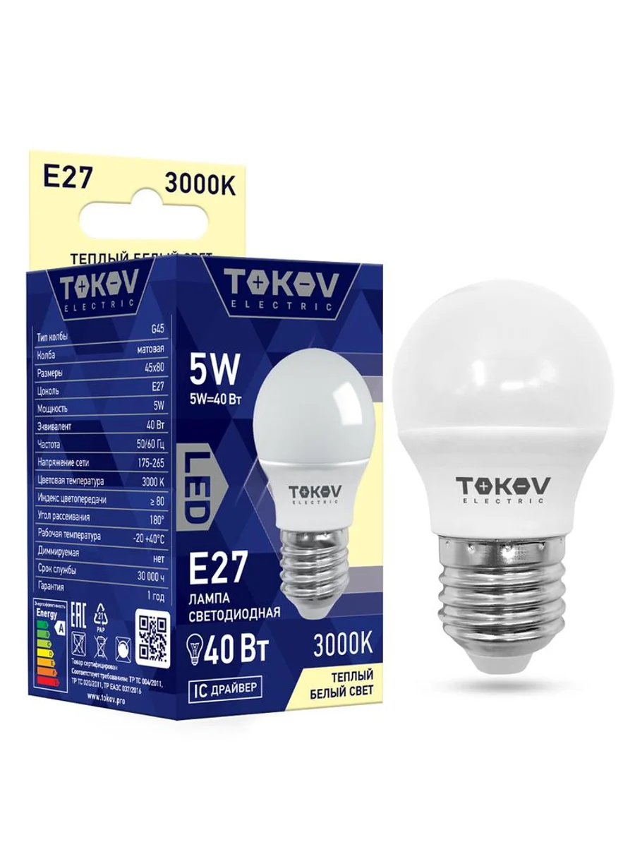 Лампа светодиодная 5Вт G45 3000К Е27 176-264В TOKOV ELECTRIC TKE-G45-E27-5-3K | KeepBuilding