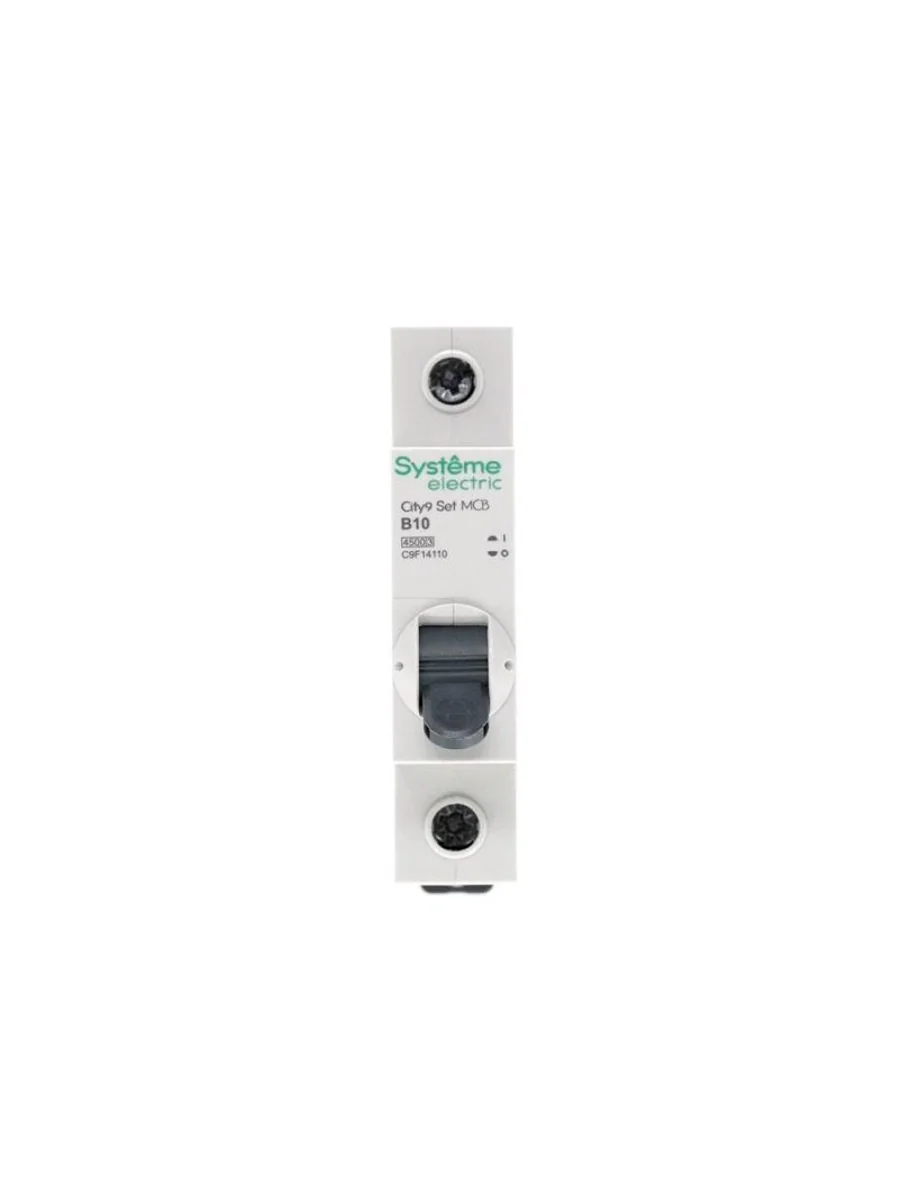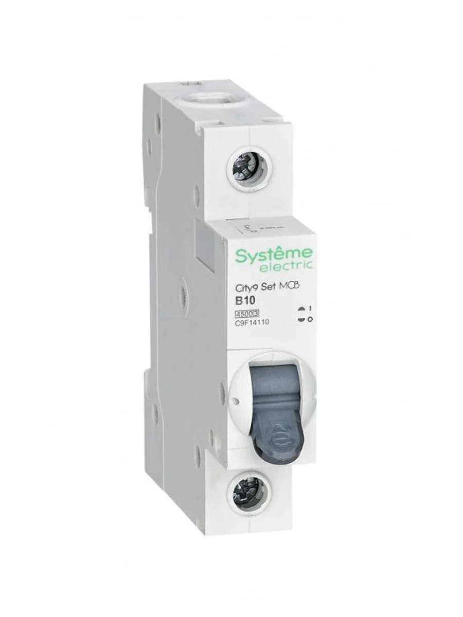 Автоматический выключатель серии City9 Set Systeme Electric, 1-полюсный, номинальный ток 10 А, характеристика B, Icn = 4.5 кА. Применяется в электрических сетях напряжением 230 В. Предназначен для защиты от перегрузок и токов короткого замыкания. Оснащен механизмом «мгновенной коммутации». Ударопрочный корпус из специального пластика с 6 металлическими заклепками. Безопасные клеммы исключают попадание кабелей в заклеммное пространство (ранее Schneider Electric EZ9F14110).
