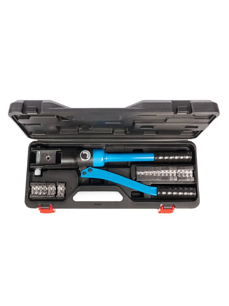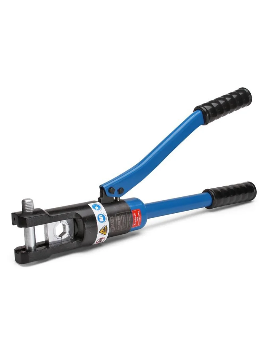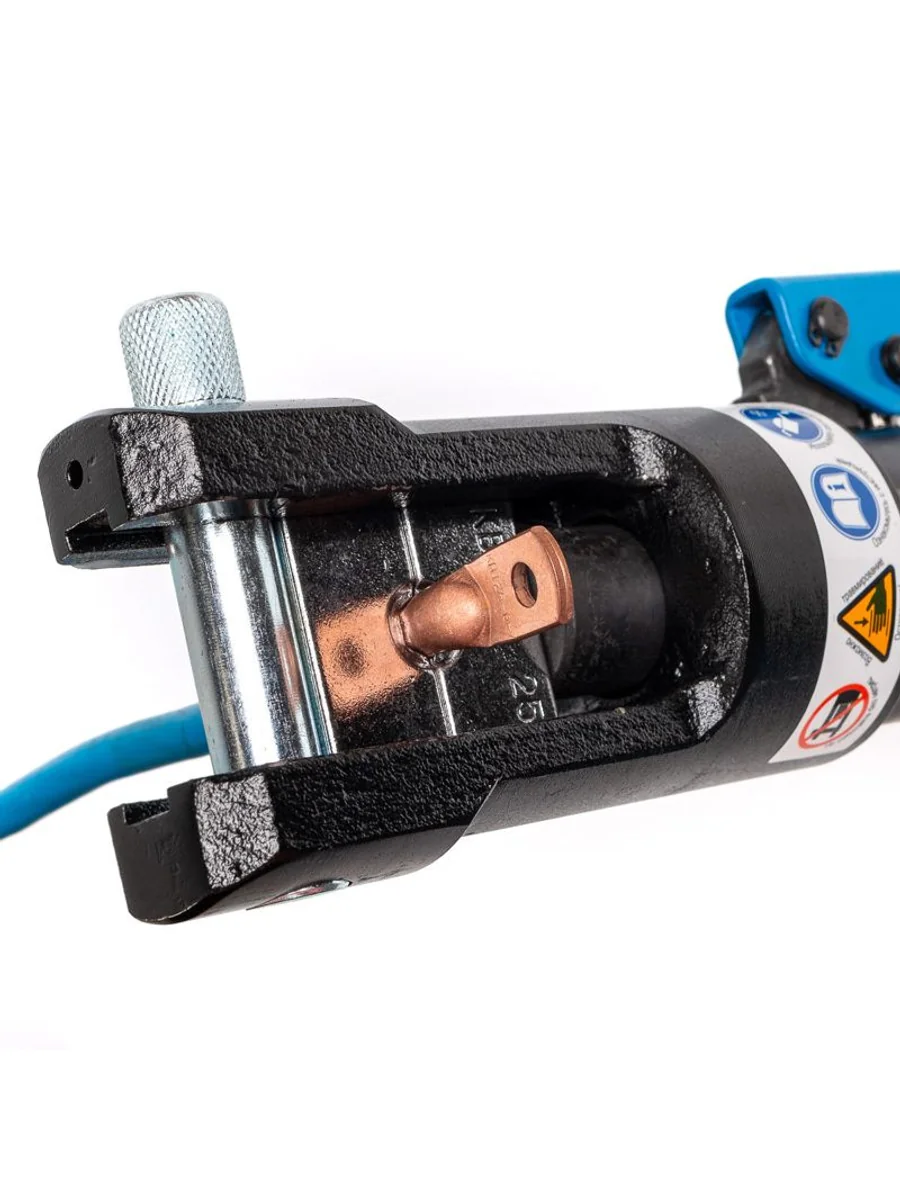 • Предназначены для опрессовки медных и алюминиевых неизолированных трубчатых наконечников • В комплекте: • ручной гидравлический пресс ПГР-300 • набор из 12 сменных матриц • ремкомплект (уплотнительные кольца) • прочный пластиковый кейс • Диапазон сечений: • кабельные наконечники 10–300 мм2 • Двухскоростная помпа с механизмом быстрого хода поршня • Клапан ручного сброса давления • Усиленная рабочая голова • Максимальное усилие: 12 т • Вес комплекта/инструмента: 6.20/3.60 кг • Длина: 470 мм • Габариты кейса: 490х185х90 мм • Дополнительные аксессуары: наборы матриц НМ-300 ТМ, НМ-300 ТМЛс, НМ-300 ТА, НМ-300 DIN, НМ-300 ПМ, НМ-300 СОАС, НМ-300 НШВИ, НМ-300 С, НМ-300 СИП