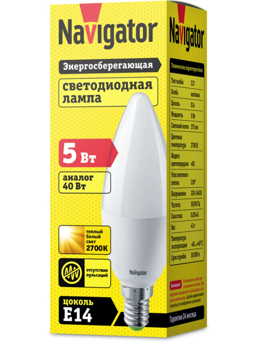 Лампа светодиодная 94 480 NLL-P-C37-5-230-2.7K-E14-FR 5Вт свеча 2700К тепл. бел. E14 330лм 176-264В Navigator 94480 - купить в KeepBuilding | KeepBuilding