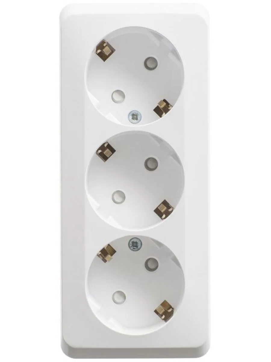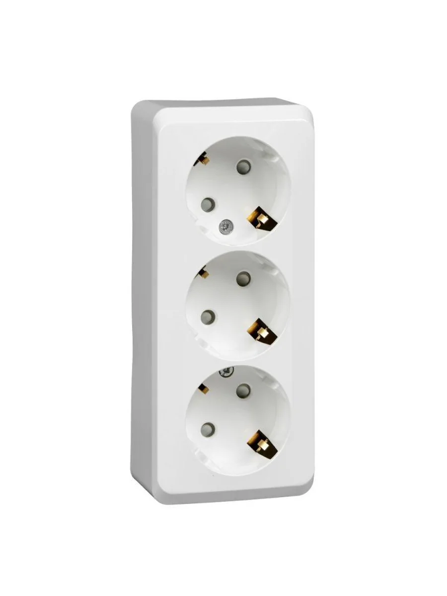 Розетка Systeme Electric (ранее Schneider Electric) ЭТЮД (белый, открытой установки) трёхместная с заземлением и шторками предназначена для применения в сетях до 250В, на ток до 16А. Трёхместная розетка позволяет подключить три устройства в одном месте. Шторки и заземление обеспечивают дополнительную безопасность при косвенных прикосновениях. Сделано в России.