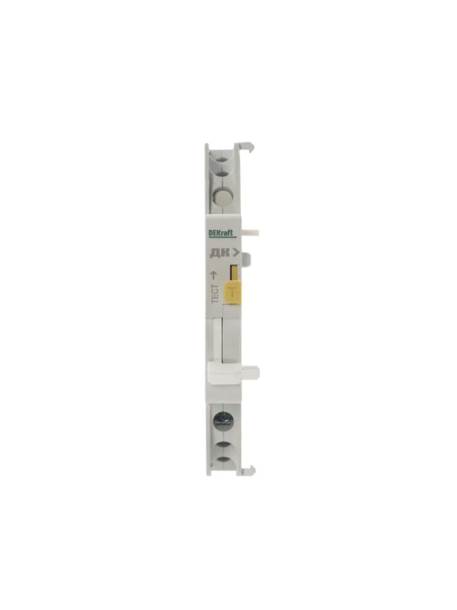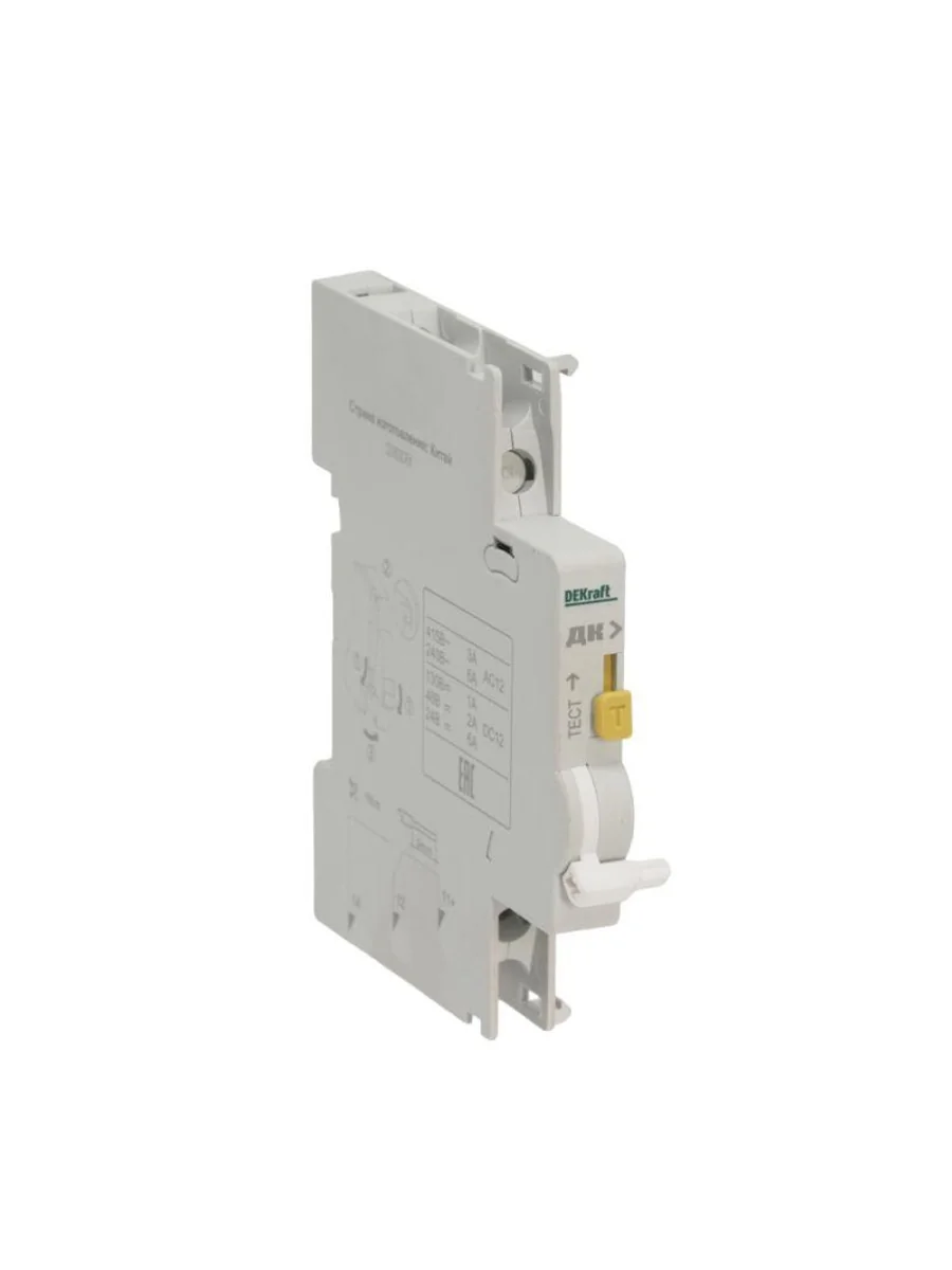 Контакт дополнительный ДК-105 для автоматических выключателей серии ВА-105 и ВА-105 DC Dekraft; предназначен для сигнализации состояния выключателя ВКЛ/ОТКЛ; тип контакта переключающий; ширина 9 мм; присоединение к выключателю слева.