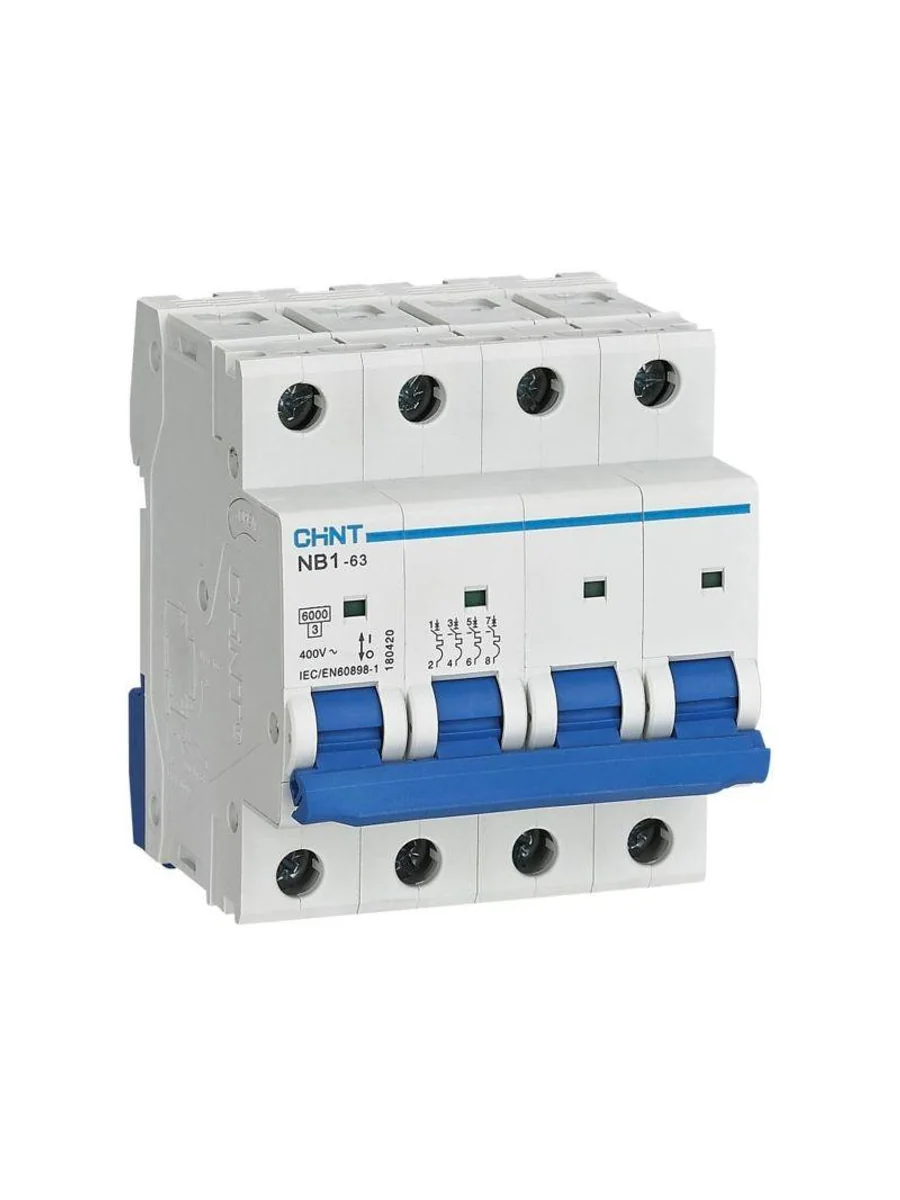 Модульные автоматические выключатели серии NB1-63 предназначены для применения в сетях переменного тока напряжением 220/400 В частотой 50/60 Гц с номинальным током до 63 А для нечастых включений и отключений нагрузок, а также защиты от перегрузки и короткого замыкания в электроустановках жилых, общественных и промышленных зданий. Основные характеристики: Номинальный ток – от 1 А до 63 А Исполнение по числу полюсов – 1P, 1P+N, 2P, 3P, 4P, 3P+N Тип характеристики мгновенного срабатывания – B, C и D Отключающая способность – 6000 A Механическая износостойкость – 20000 циклов В/О Электрическая износостойкость – 10000 циклов В/О Категория применения – A Класс токоограничения – 3 Степень загрязнения – 2 Степень защиты – IP20 Ширина полюса – 18 мм Монтаж – на симметричную DIN-рейку 35 мм Подключение – кабелем, шины типа PIN и FORK Сигнализация – окошко индикации положения главных контактов Автоматические выключатели серии NB1-63 дополнительно могут оснащаться следующими устройствами: - вспомогательный контакт состояния XF9; - сигнальный контакт аварийного срабатывания XF9J; - независимый расцепитель S9 или расцепитель минимального/максимального напряжения V9.