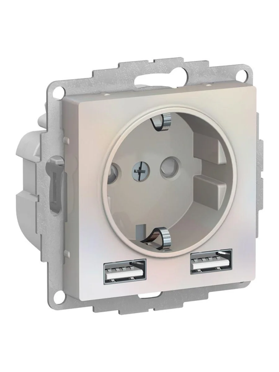 Розетка силовая Systeme Electric (ранее Schneider Electric) серии AtlasDesign 16А в цвете жемчуг с заземлением и шторками с розеткой USB, с двумя разъемами типа А. Заземляющий контакт обеспечивает дополнительную защиту от удара электрическим током. Шторки обеспечивают дополнительную безопасность в доме, где находятся дети. Одно устройство позволяет как подключить бытовые приборы, так и зарядить мобильные устройства.