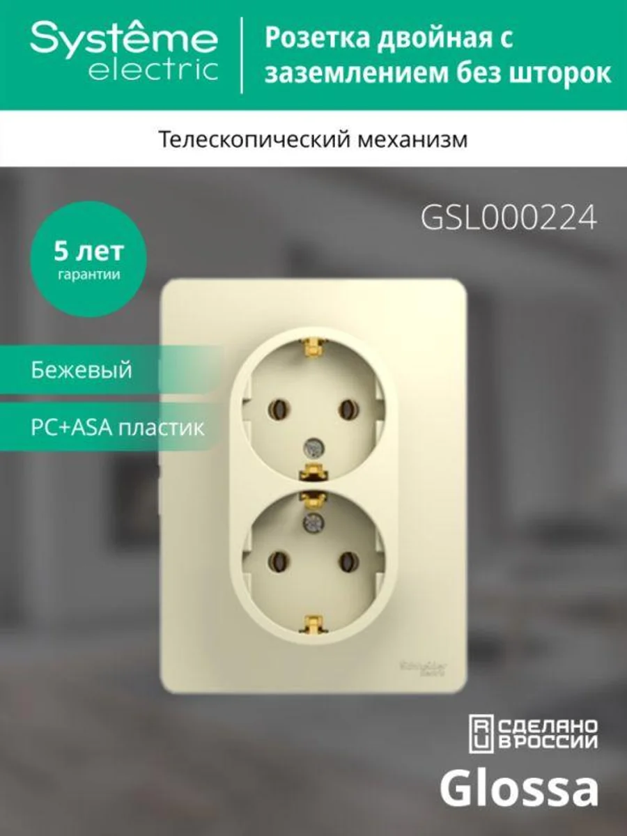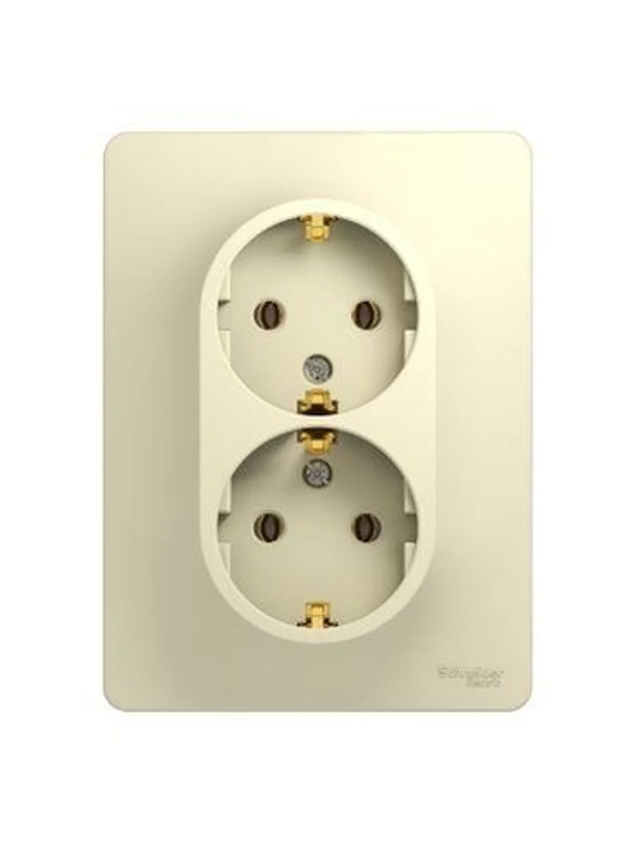 Розетка двойная Systeme Electric (ранее Schneider Electric) серии Glossa (в сборе, цвет бежевый) с заземлением, без шторок подходит для сетей 250 В, на ток 16 А. - Заземляющий контакт обеспечивает дополнительную защиту от удара электрическим током. При наличии заземления электрический потенциал уходит в землю, защищая человека. - Выполнен из материала PС+ASA, стойкого к УФ-излучению и появлению царапин. - Двойная розетка позволяет подключить два устройства в одном месте.