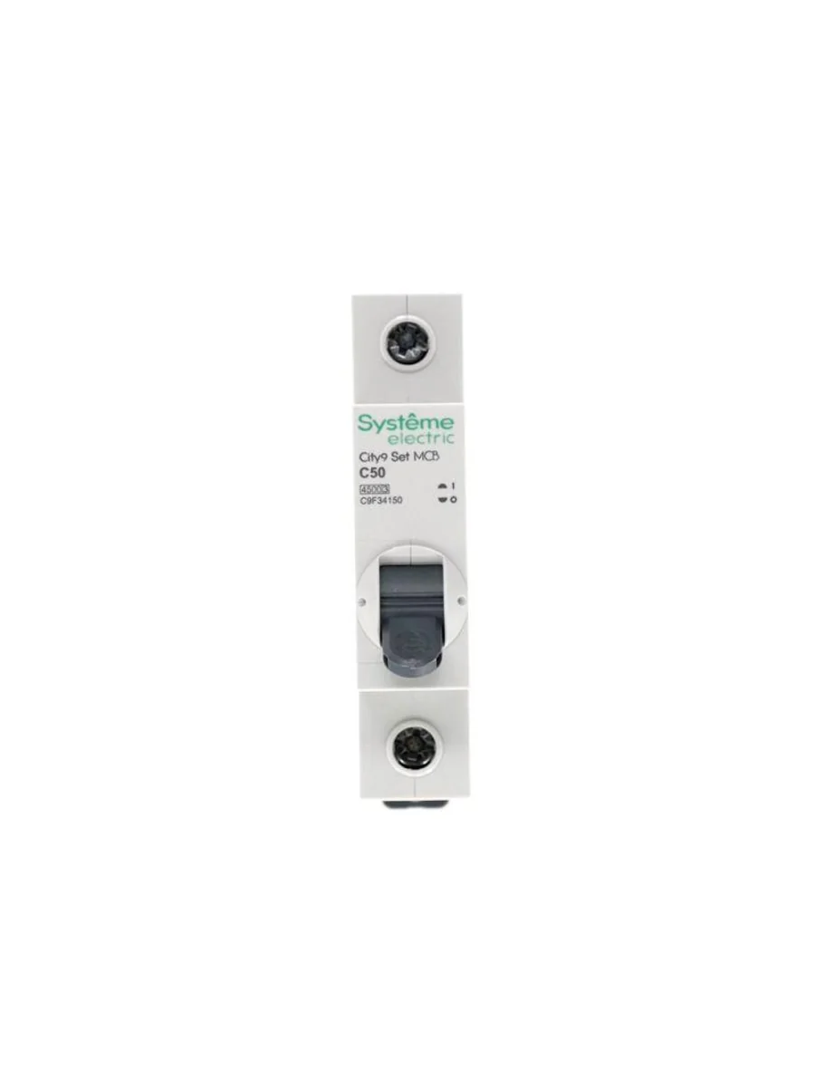 Автоматический выключатель серии City9 Set Systeme Electric, 1-полюсный, номинальный ток 50 А, характеристика С, Icn = 4.5 кА. Применяется в электрических сетях напряжением 230 В. Предназначен для защиты от перегрузок и токов короткого замыкания. Оснащен механизмом «мгновенной коммутации». Ударопрочный корпус из специального пластика с 6 металлическими заклепками. Безопасные клеммы исключают попадание кабелей в заклеммное пространство (ранее Schneider Electric EZ9F34150).