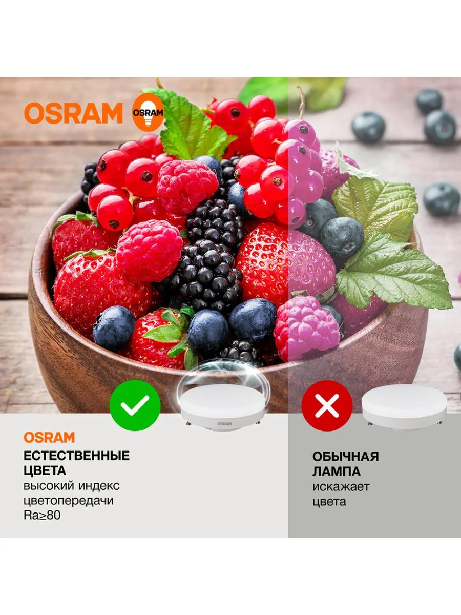 Светодиодные лампы OSRAM - разумная замена традиционным лампам накаливания или галогенным лампам. Светодиодные лампы OSRAM снижают затраты на освещение до 90% при сохранении привычного уровня освещенности. Эта лампа OSRAM серии LED Value выполнена в форме колбы GX с цоколем GX53. Материал колбы - пластик, исполнение - матовое. Световой поток 480 люмен, что соответствует лампе накаливания на 50 Вт. Такие лампы обычно используют для потолков; обязательно проверьте совместимость со светильником. Эта лампа излучает нейтральный белый свет, угол пучка - узкий. Качество света на высоте: низкие пульсации защищают глаза, а высокий индекс цветопередачи позволяет видеть мир в его истинном цвете. Кроме того, лампы OSRAM полностью безопасны для здоровья, поскольку в них нет опасных материалов по европейскому стандарту RoHS, а также они не производят вредных электромагнитных излучений, что подтверждено ЭМС (сертификат электромагнитной совместимости). Лампа проработает долго: срок службы - 25000 часов, 2 года гарантии. Светодиодные лампы OSRAM - умный выбор для здоровья семьи и кошелька!