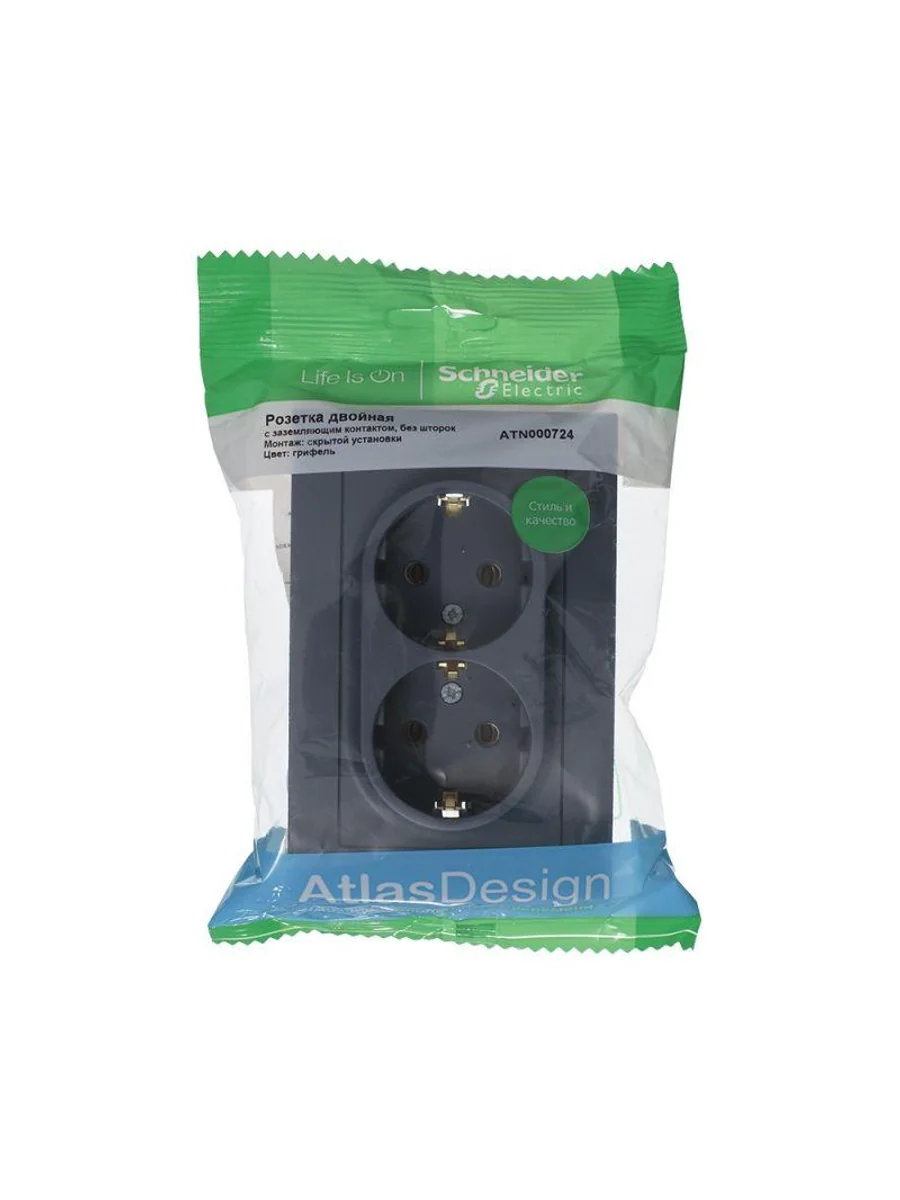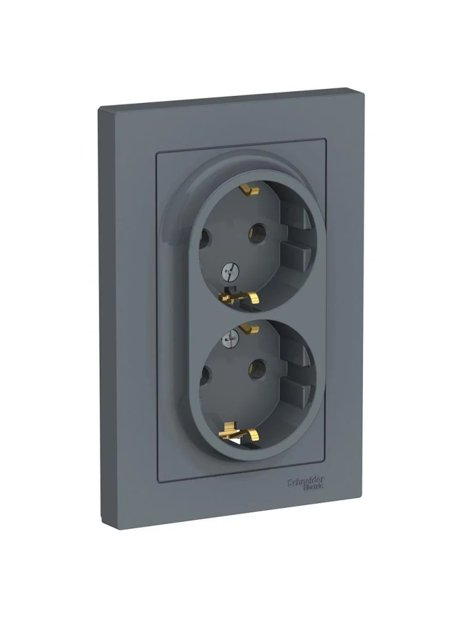 Розетка двойная в сборе Systeme Electric (ранее Schneider Electric) серии AtlasDesign в цвете грифель с заземлением, без шторок подходит для сетей 250 В, на ток 16 А. Заземляющий контакт обеспечивает дополнительную защиту от удара электрическим током. Лицевые детали из качественного ABS-пластика, устойчивого к царапинам и УФ-излучению. Двойная розетка позволяет подключить два устройства в одном месте. Изделие поставляется в комплекте с рамкой того же цвета.
