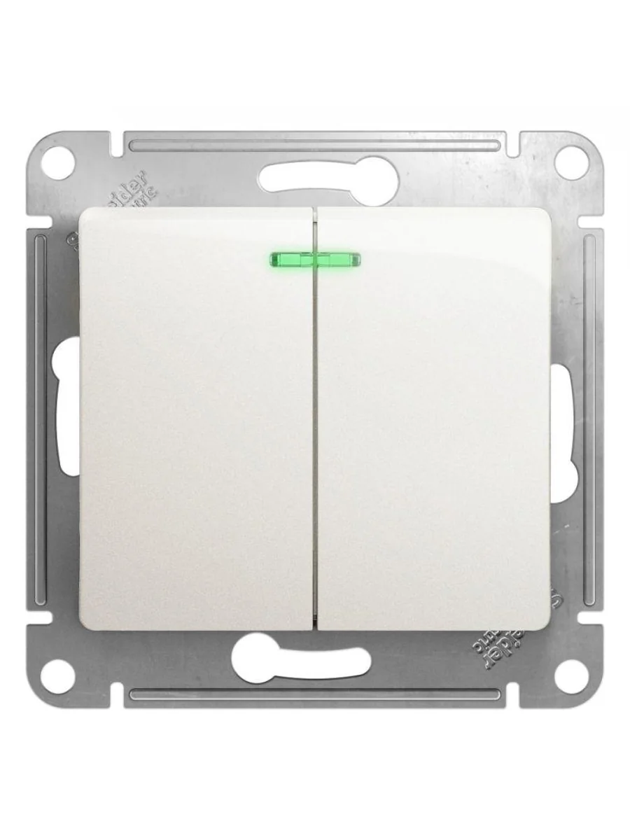 Механизм Systeme Electric (ранее Schneider Electric) серии Glossa (цвет перламутр) выключателя 2-клавишного c подсветкой подходит для сетей 250 В, на ток 10 А. - Благодаря современной светодиодной подсветке зеленого цвета изделие легко найти в темноте. - Двухклавишный выключатель позволяет управлять двумя источниками света с одной точки. - Выполнен из материала PС+ASA, стойкого к УФ-излучению и появлению царапин. - Эргономичные клеммы расположены в два ряда: сверху и снизу.