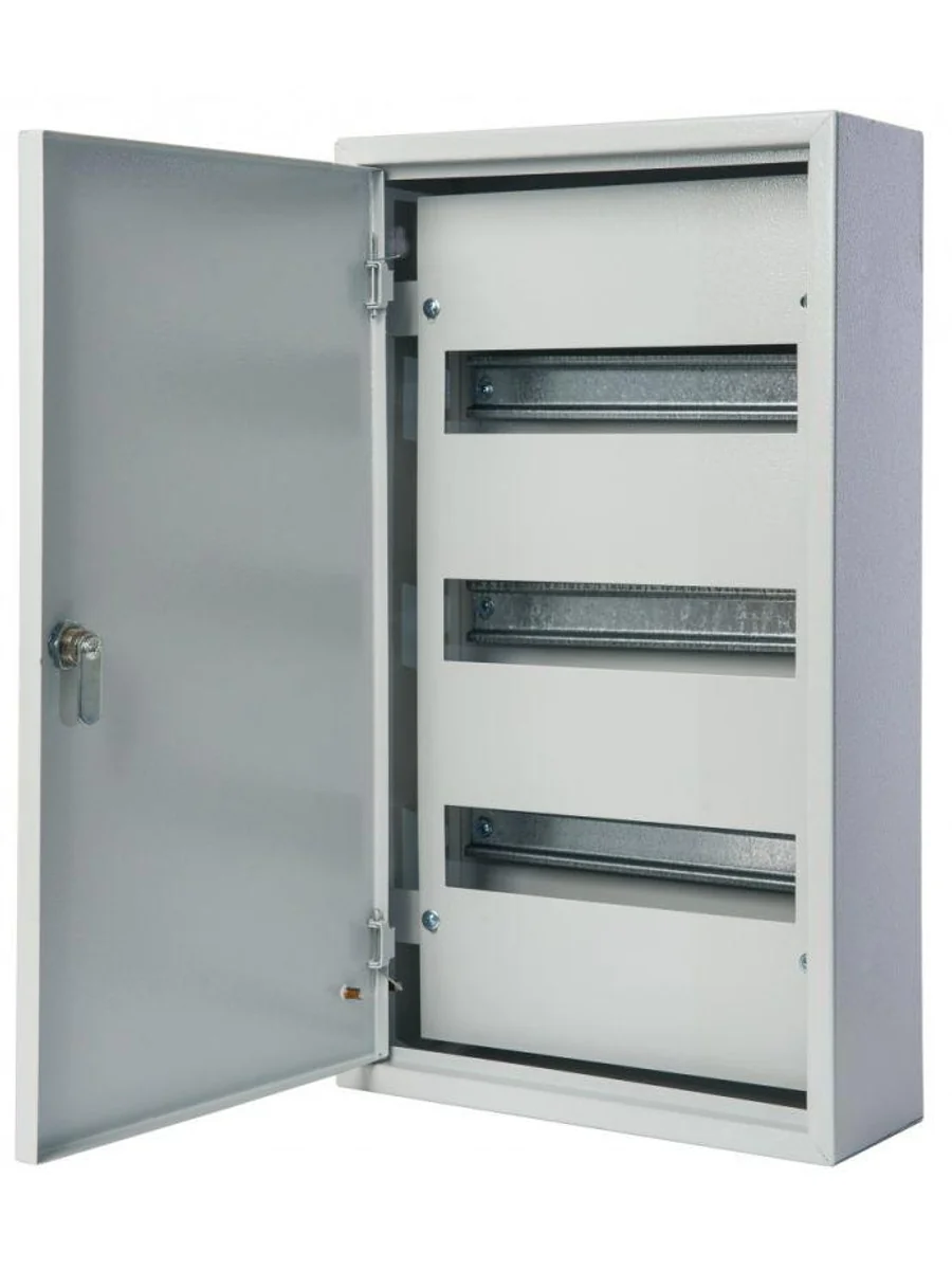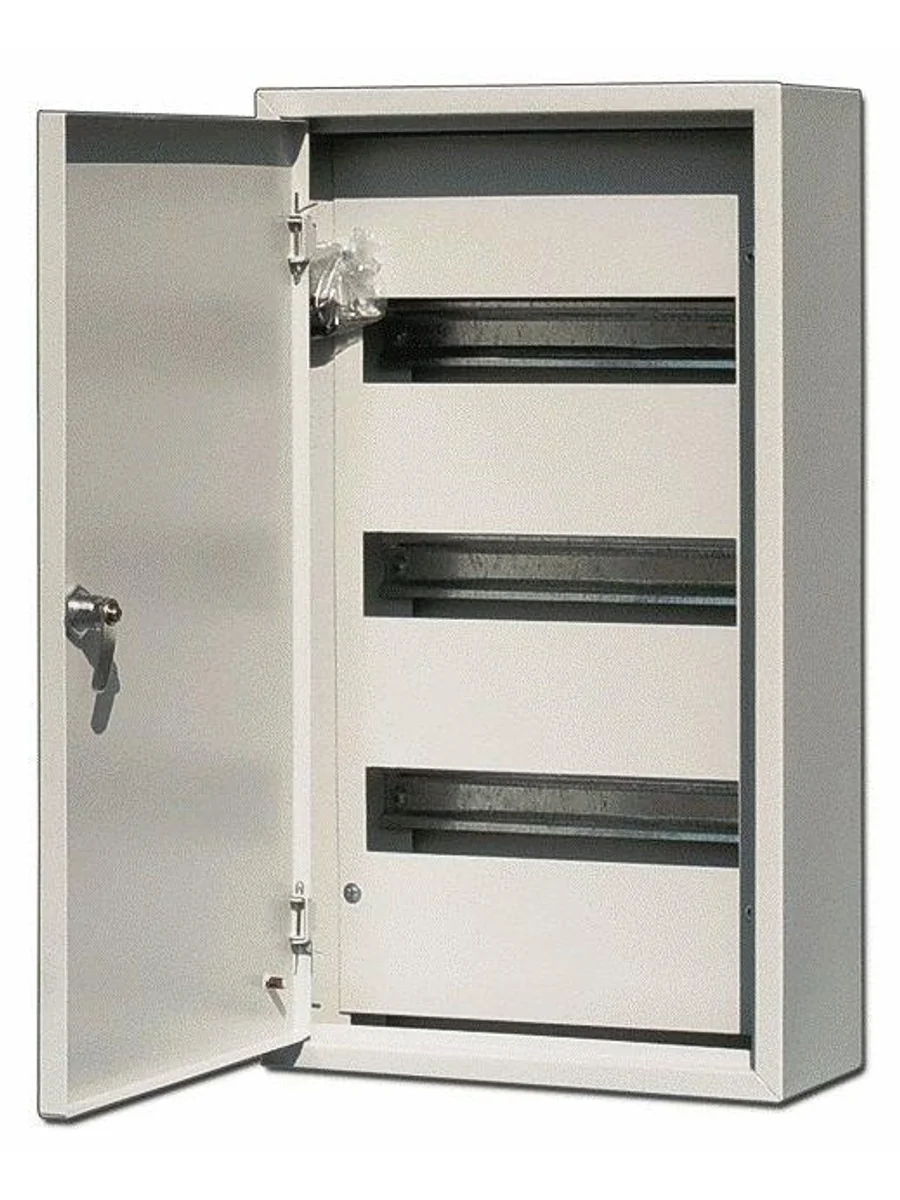 Щит распределительный серии ЩРН Dekraft; навесной; номинальный ток до 125 А; исполнение – 36 мод. х 18 мм, 3 ряда; ВхШхГ - 520х300х120 мм; материал – сталь; цвет - серый (RAL 7035); степень защиты - IP31. Щиты ЩРН имеют встроенные DIN-рейки для модульной аппаратуры, элементы крепления шин N и PE, болты заземления на дверце и на корпусе, дверь с замком и ключом. Доступ к токопроводящим частям закрыт съемной фальшпанелью. Ввод кабелей для всех щитов осуществляется сверху или снизу.