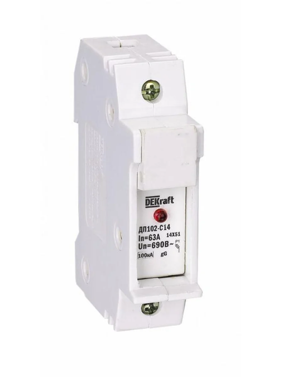 Держатель серии ДП-102 цилиндрического предохранителя ПЦ-102 Dekraft; 1P; для габарита С10 (10 x 38 мм); со светодиодной индикацией срабатывания; номинальный ток – до 32 А; ширина – 1 модуль х 18 мм; установка – на DIN- рейку; рабочее положение - любое, но предпочтительнее вертикальное; подключение питания - сверху или снизу; степень защиты – IP20. Предохранители применяются для защиты сетей от перегрузки и токов КЗ в сетях напряжением до 500 В.