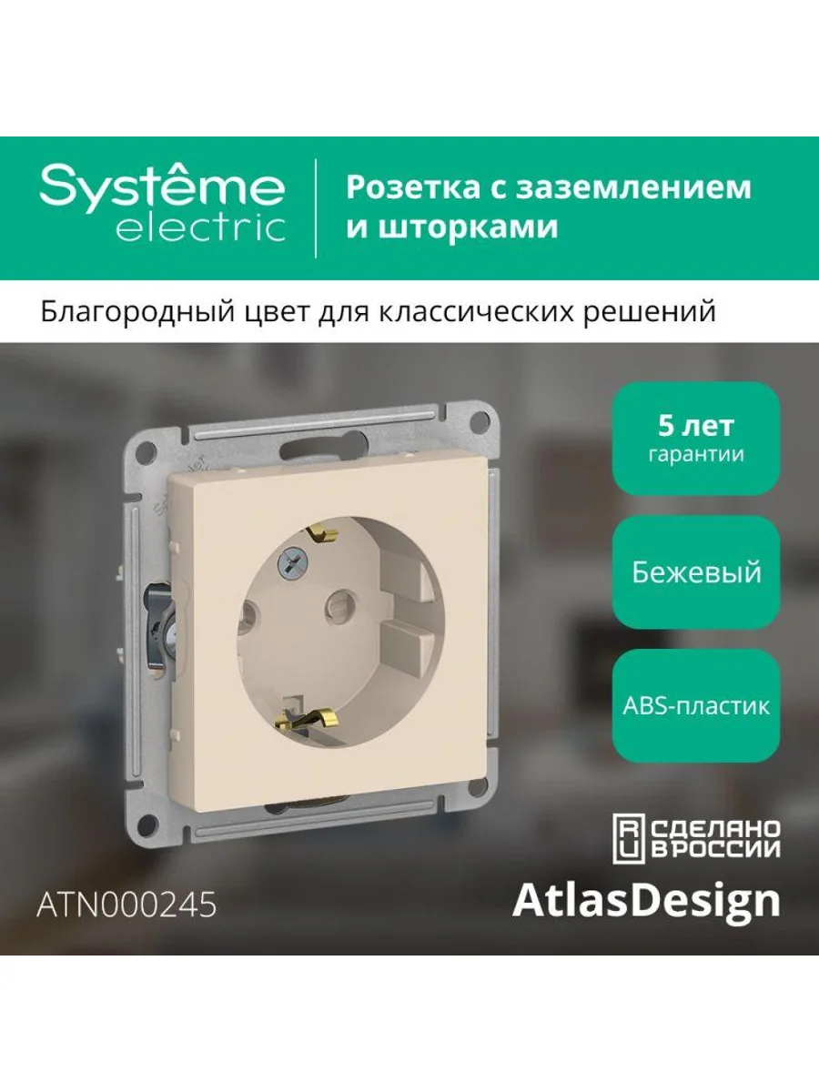 Механизм Systeme Electric (ранее Schneider Electric) серии AtlasDesign в цвете бежевый розетки одинарной с заземлением и шторками подходит для сетей 250 В, на ток 16 А. Заземляющий контакт обеспечивает дополнительную защиту от удара электрическим током. При наличии заземления электрический потенциал уходит в землю, защищая человека. Лицевые детали из качественного ABS-пластика, устойчивого к царапинам и УФ-излучению. Усиленные прямые монтажные лапки для лучшей фиксации механизма в монтажной коробке.