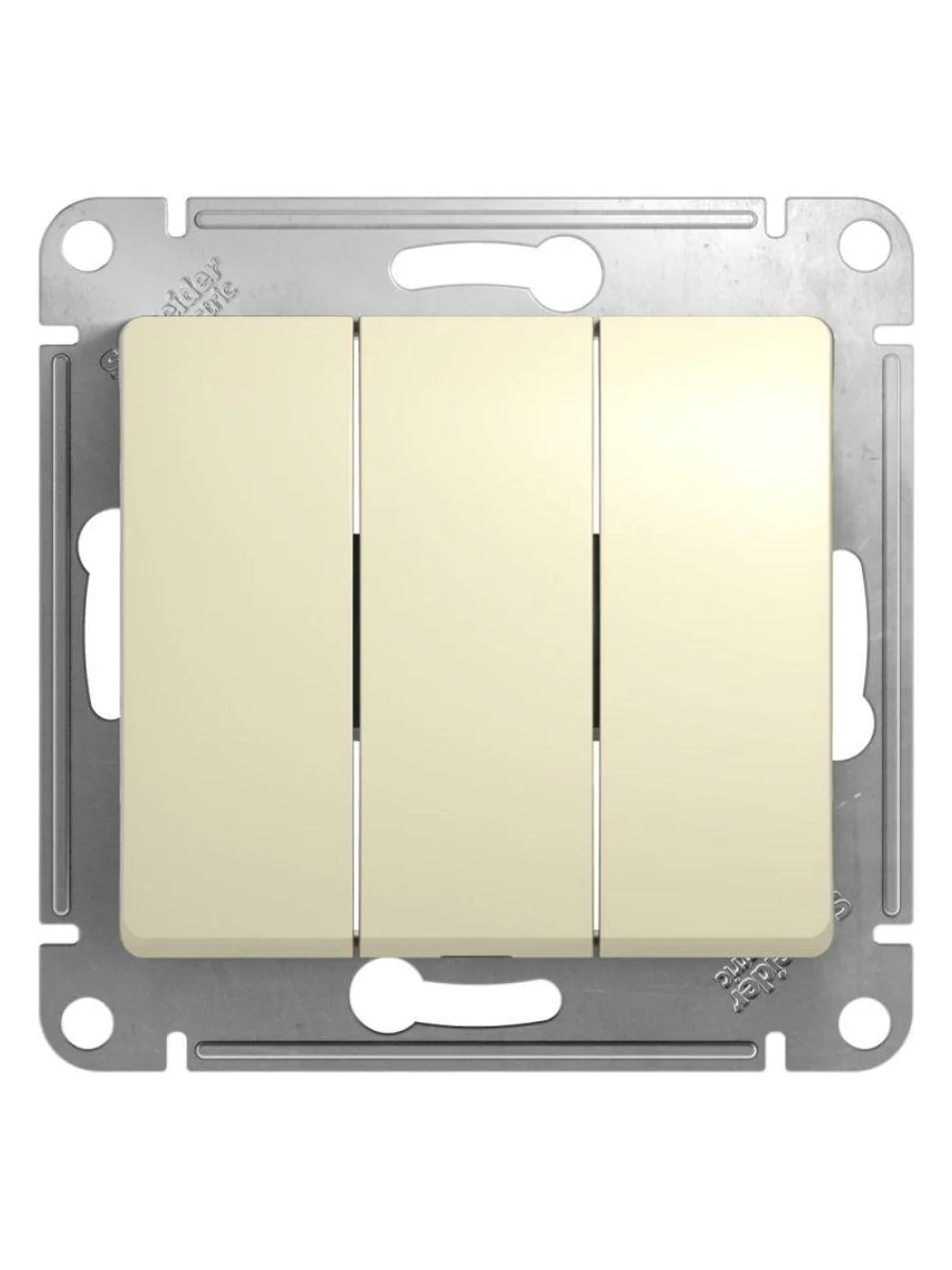 Механизм Systeme Electric (ранее Schneider Electric) серии Glossa (цвет бежевый) выключателя 3-клавишного подходит для сетей 250 В, на ток 10 А. - Трёхклавишный выключатель позволяет управлять тремя источниками света из одной точки. - Выполнен из материала PС+ASA, стойкого к УФ-излучению и появлению царапин. - Эргономичные клеммы расположены в два ряда: сверху и снизу.