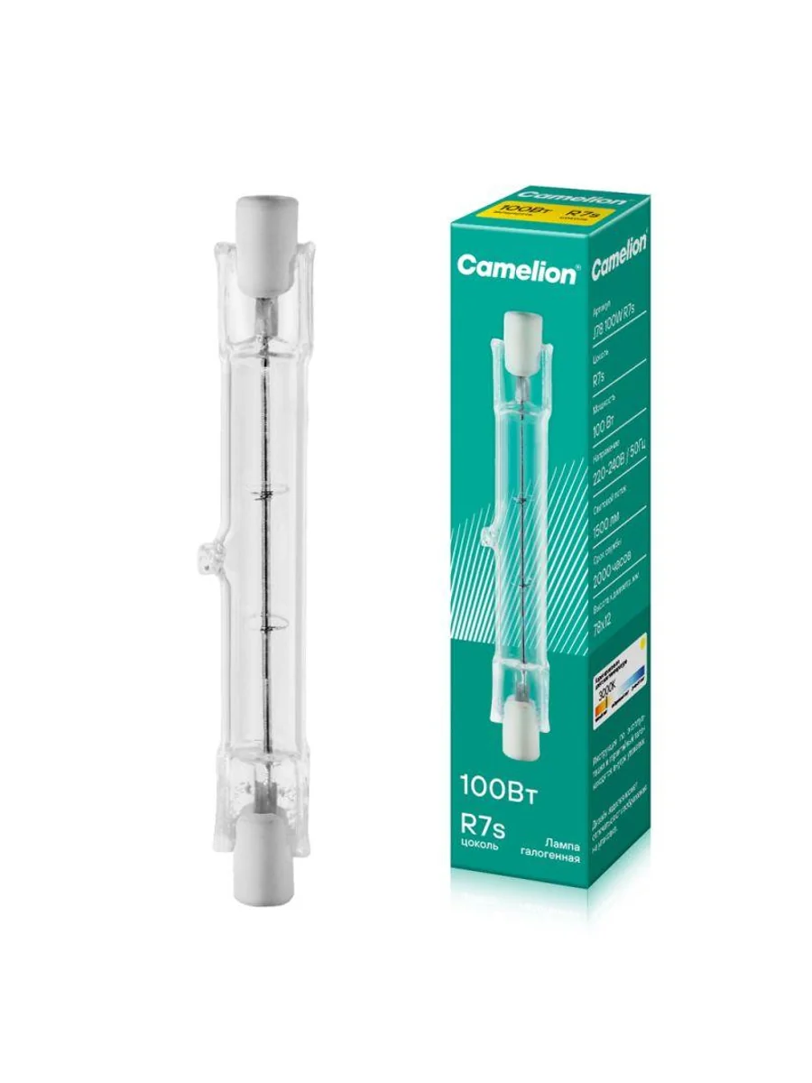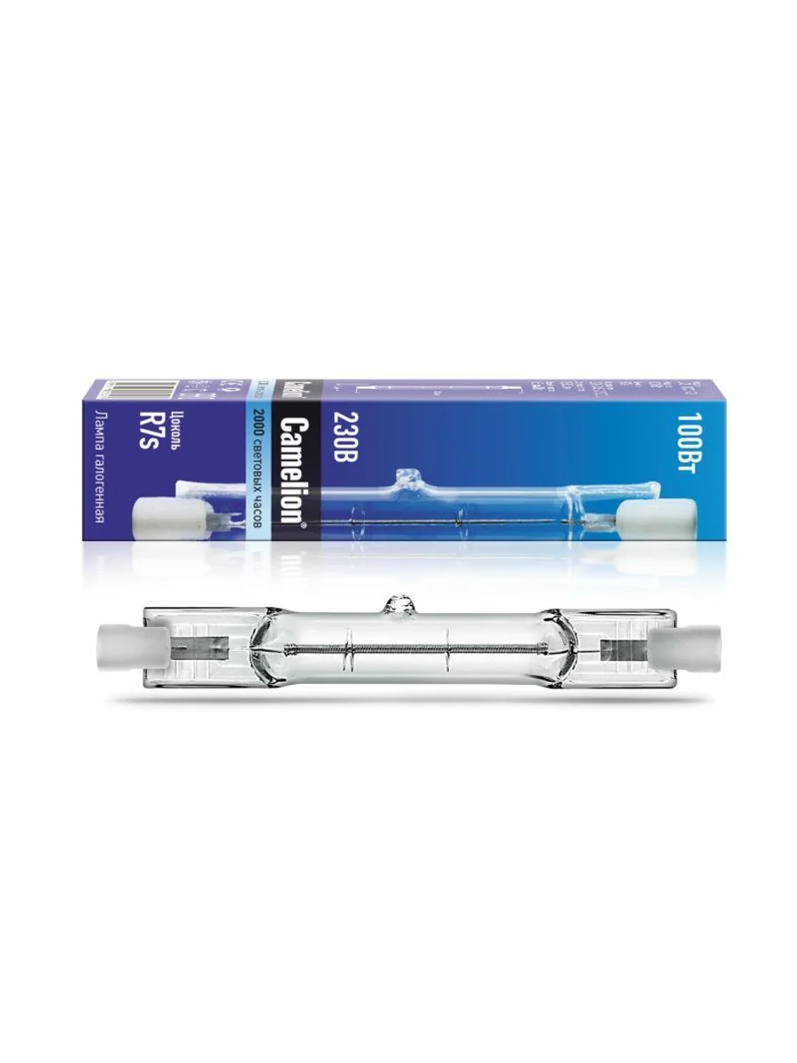 Галогенные лампы предназначены для светильников внутреннего и наружного освещения, прожекторов. Лампы имеют повышенный срок службы - работают вдвое дольше обычных ламп накаливания. Могут использоваться с регуляторами яркости. Галогенная лампа, мощность, Вт - 100, напряжение, В - 220-240, световой поток, лм - 1500, форма колбы - тип J, цвет колбы - прозрачная, цоколь R7s, цветовая температура, К - 3000, срок службы, ч. - 2000