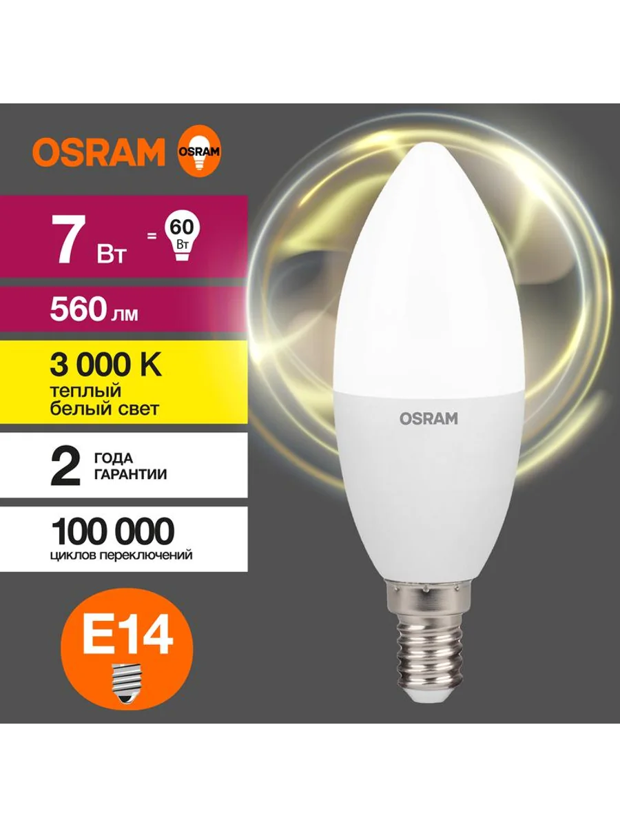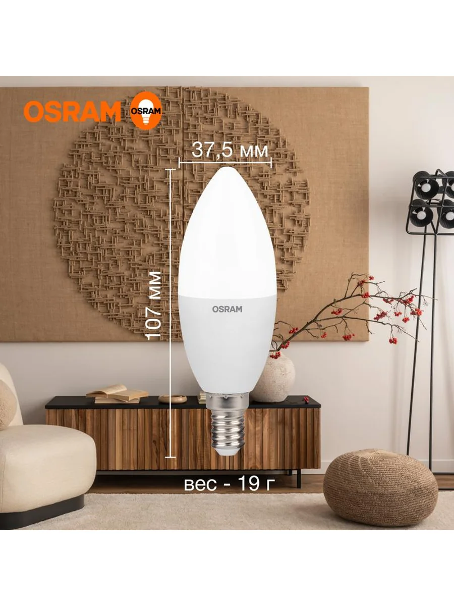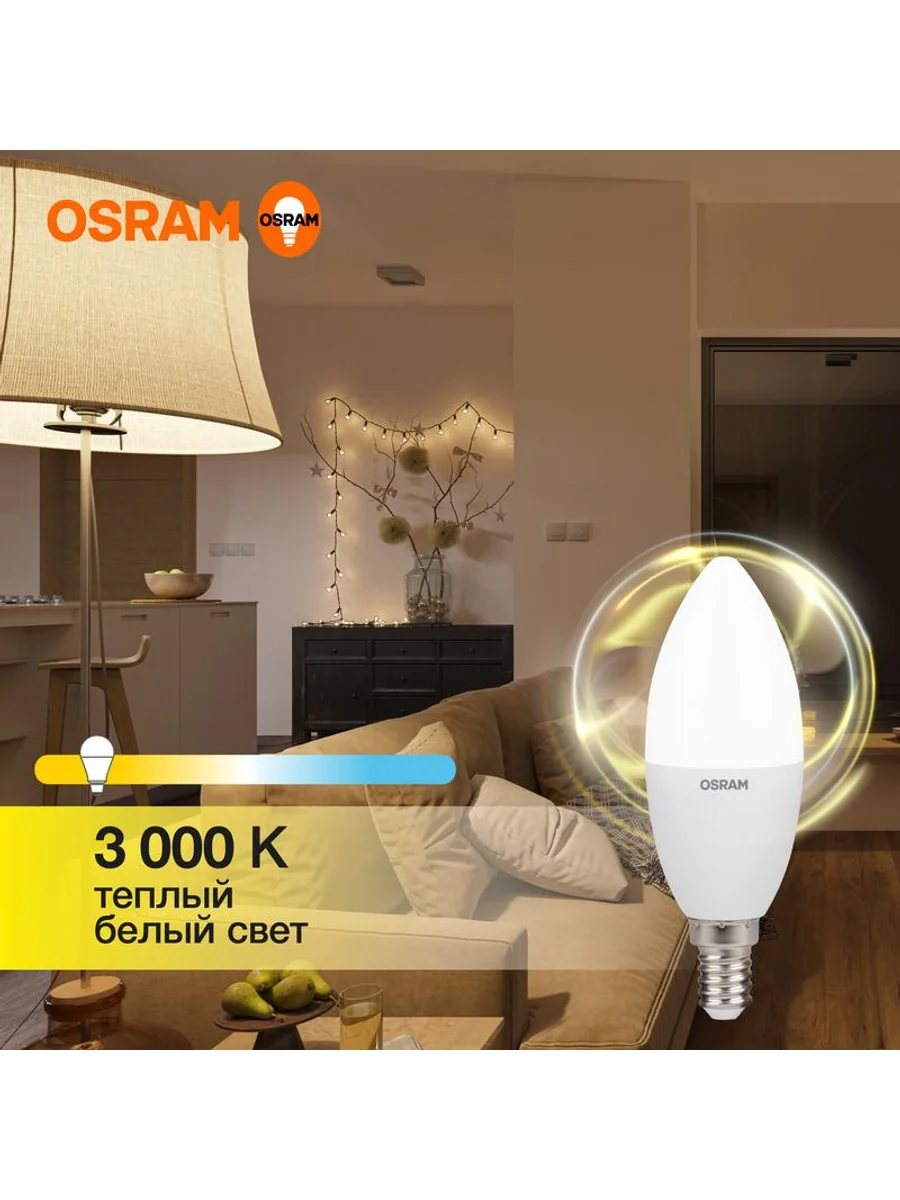Светодиодные лампы OSRAM - разумная замена традиционным лампам накаливания или галогенным лампам. Светодиодные лампы OSRAM снижают затраты на освещение до 90% при сохранении привычного уровня освещенности. Эта лампа OSRAM серии LED Value выполнена в форме колбы B ("свеча") с цоколем E14. Материал колбы - пластик, исполнение - матовое. Световой поток 560 люмен, что соответствует лампе накаливания на 60 Вт. Такие лампы применяются для внутреннего освещения, хотя в закрытом светильнике можно использовать и на улице. Эта лампа излучает теплый белый свет, угол пучка - широкий. Качество света на высоте: низкие пульсации защищают глаза, а высокий индекс цветопередачи позволяет видеть мир в его истинном цвете. Кроме того, лампы OSRAM полностью безопасны для здоровья, поскольку в них нет опасных материалов по европейскому стандарту RoHS, а также они не производят вредных электромагнитных излучений, что подтверждено ЭМС (сертификат электромагнитной совместимости). Лампа проработает долго: срок службы - 25000 часов, 2 года гарантии. Светодиодные лампы OSRAM - умный выбор для здоровья семьи и кошелька!