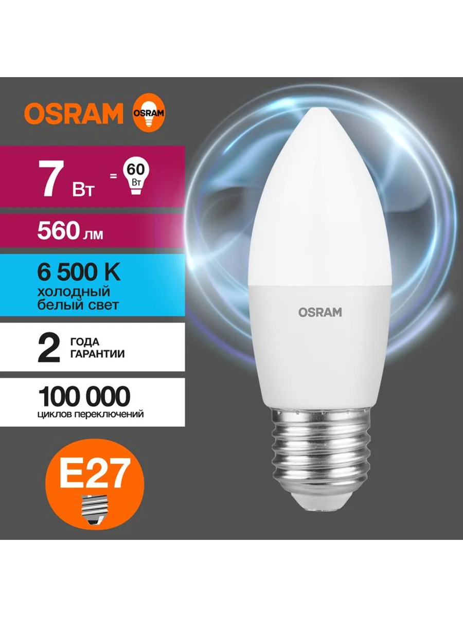 Светодиодные лампы OSRAM - разумная замена традиционным лампам накаливания или галогенным лампам. Светодиодные лампы OSRAM снижают затраты на освещение до 90% при сохранении привычного уровня освещенности. Эта лампа OSRAM серии LED Value выполнена в форме колбы B ("свеча") с цоколем E27. Материал колбы - пластик, исполнение - матовое. Световой поток 560 люмен, что соответствует лампе накаливания на 60 Вт. Такие лампы применяются для внутреннего освещения, хотя в закрытом светильнике можно использовать и на улице. Эта лампа излучает холодный белый свет, угол пучка - широкий. Качество света на высоте: низкие пульсации защищают глаза, а высокий индекс цветопередачи позволяет видеть мир в его истинном цвете. Кроме того, лампы OSRAM полностью безопасны для здоровья, поскольку в них нет опасных материалов по европейскому стандарту RoHS, а также они не производят вредных электромагнитных излучений, что подтверждено ЭМС (сертификат электромагнитной совместимости). Лампа проработает долго: срок службы - 25000 часов, 2 года гарантии. Светодиодные лампы OSRAM - умный выбор для здоровья семьи и кошелька!