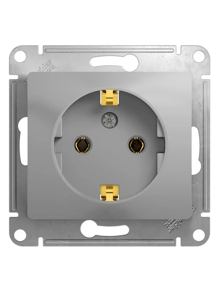 Механизм Systeme Electric (ранее Schneider Electric) серии Glossa (цвет алюминий) розетки одинарной с заземлением и без шторок подходит для сетей 250 В, на ток 16 А. - Заземляющий контакт обеспечивает дополнительную защиту от удара электрическим током. При наличии заземления электрический потенциал уходит в землю, защищая человека. - Выполнен из материала PС+ASA, стойкого к УФ-излучению и появлению царапин. - Эргономичные клеммы розеток расположены в один ряд.