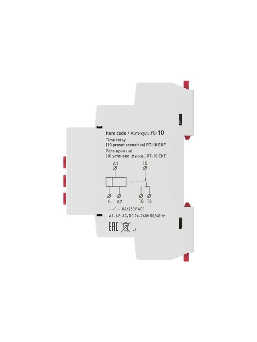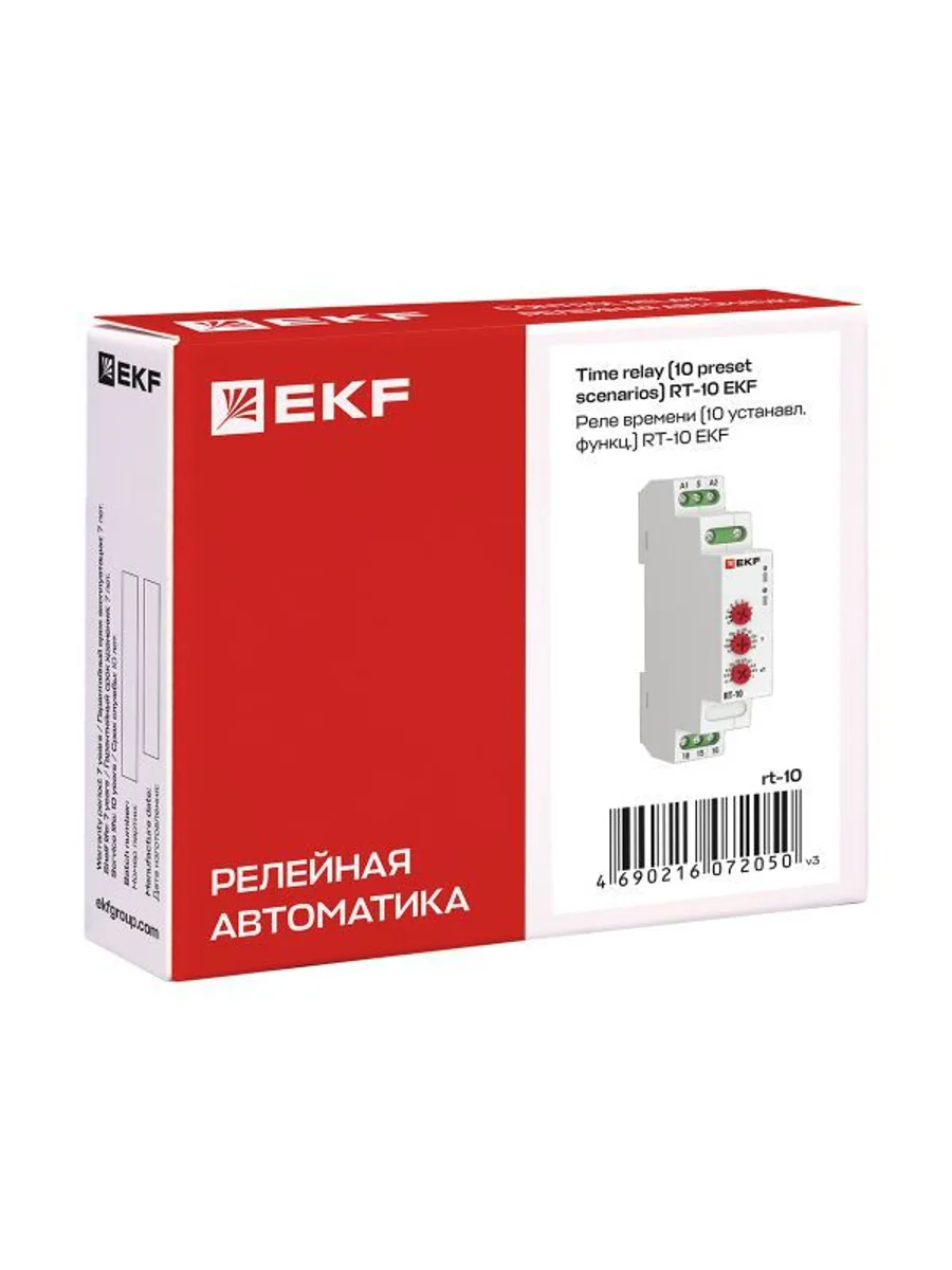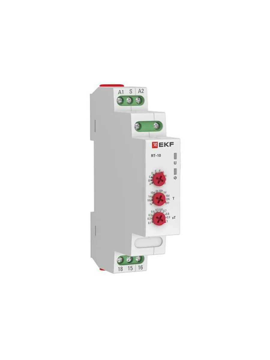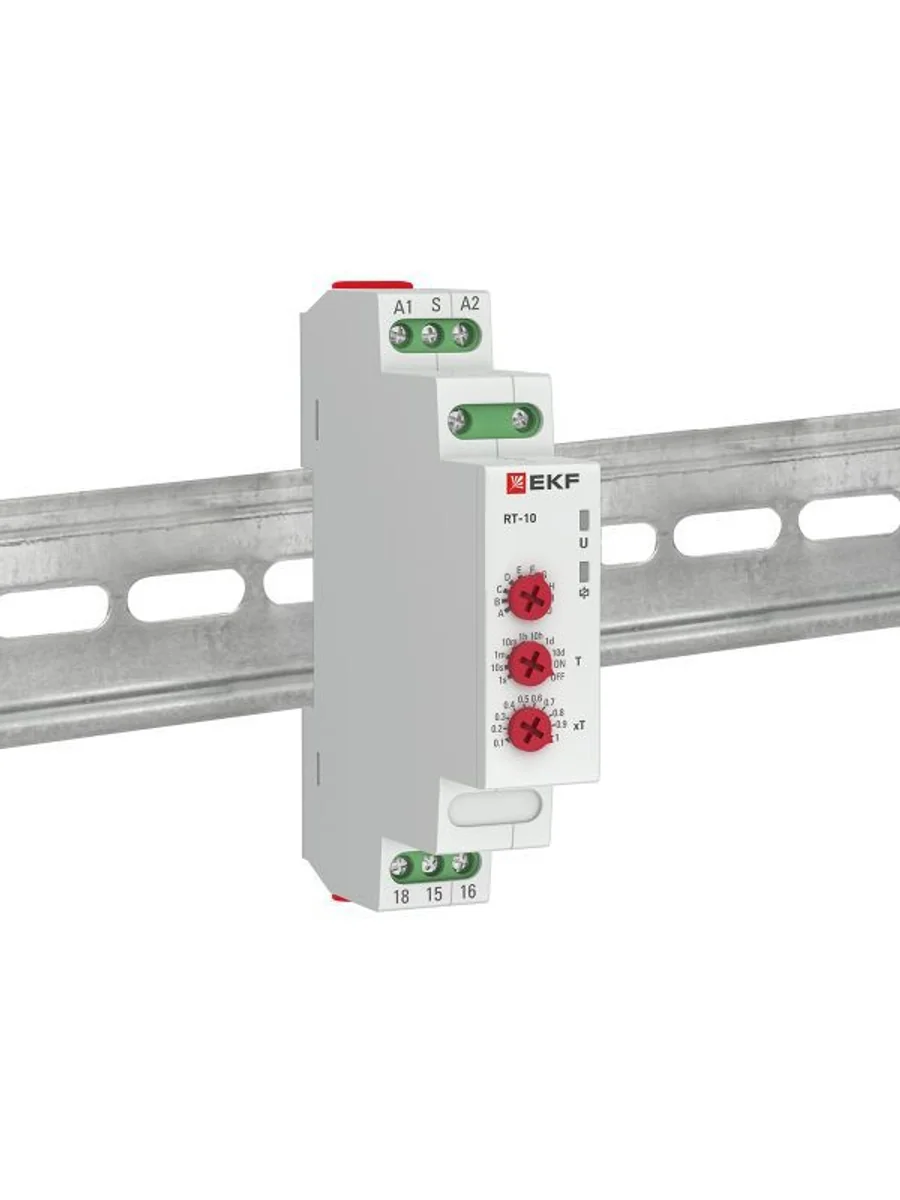 Многофункциональное реле времени RT-10 EKF является электронным коммутационным аппаратом с регулируемыми режимами работы и регулируемой установкой времени. Реле предназначено для включения или отключения нагрузки по заданным временным величинам и режимам работы. Переключение диапазонов времени и исполняемой функции производится с помощью поворотных регуляторов расположенных на лицевой поверхности реле. Реле может работать по одной из 10 возможных функций Реле применяется в системах промышленной и бытовой автоматики: в вентиляционных, отопительных, осветительных системах.