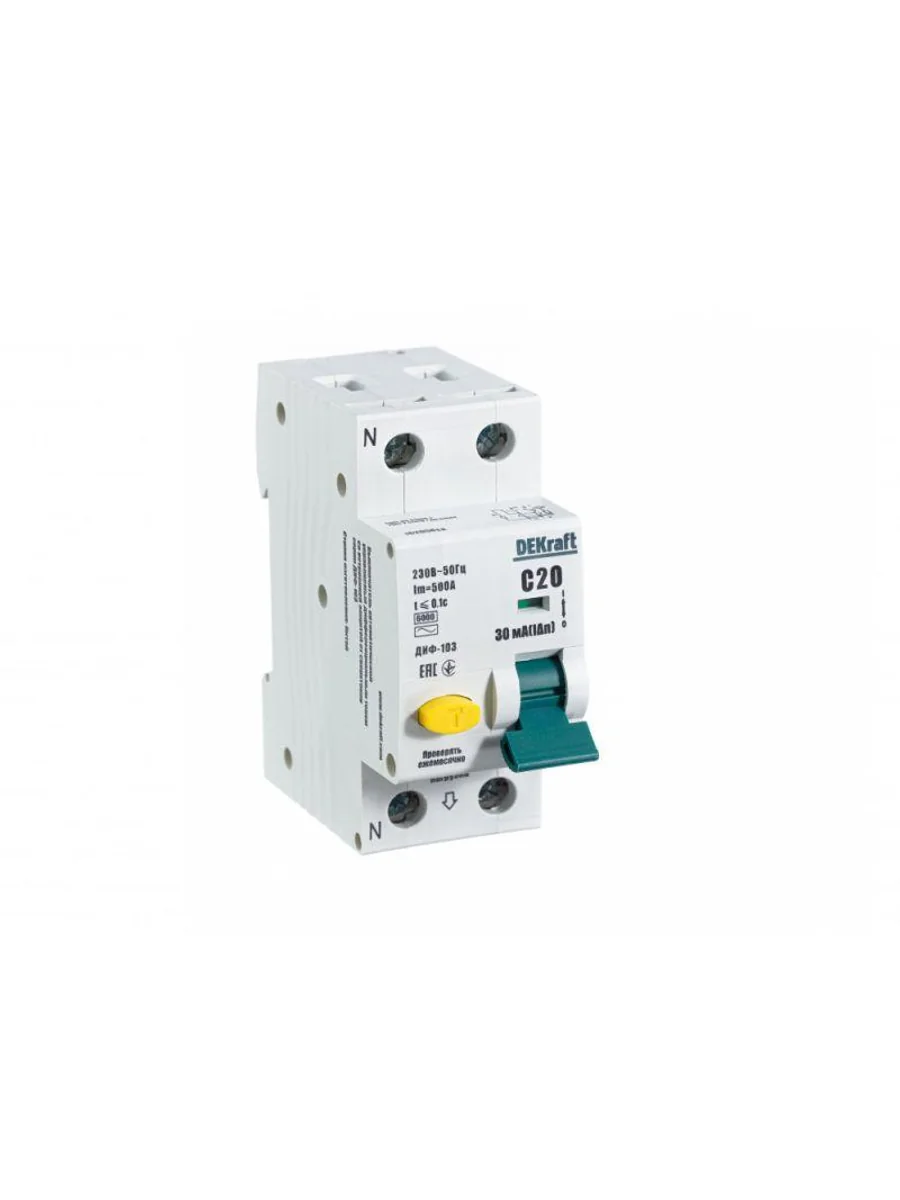 Автоматический выключатель дифференциального тока серии ДИФ-103 Dekraft; 1P+N; ном.ток 20 А; характеристика C; откл.способность Icn = 6 kA; ток утечки 30 мА; тип - АС; блок дифф.защиты – электронный; ширина – 2 мод. х 18 мм; монтаж – на DIN-рейку. АВДТ применяются в сетях напряжением до 220 В пер.тока для защиты человека от поражения электрическим током и электроустановок от сверхтоков и токов утечки. Аппараты ДИФ-103 являются более компактным вариантом АВДТ по сравнению с серией ДИФ-101.