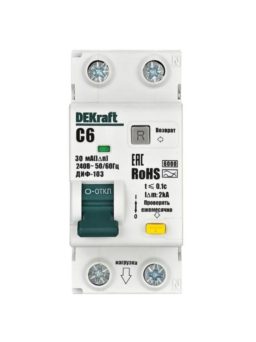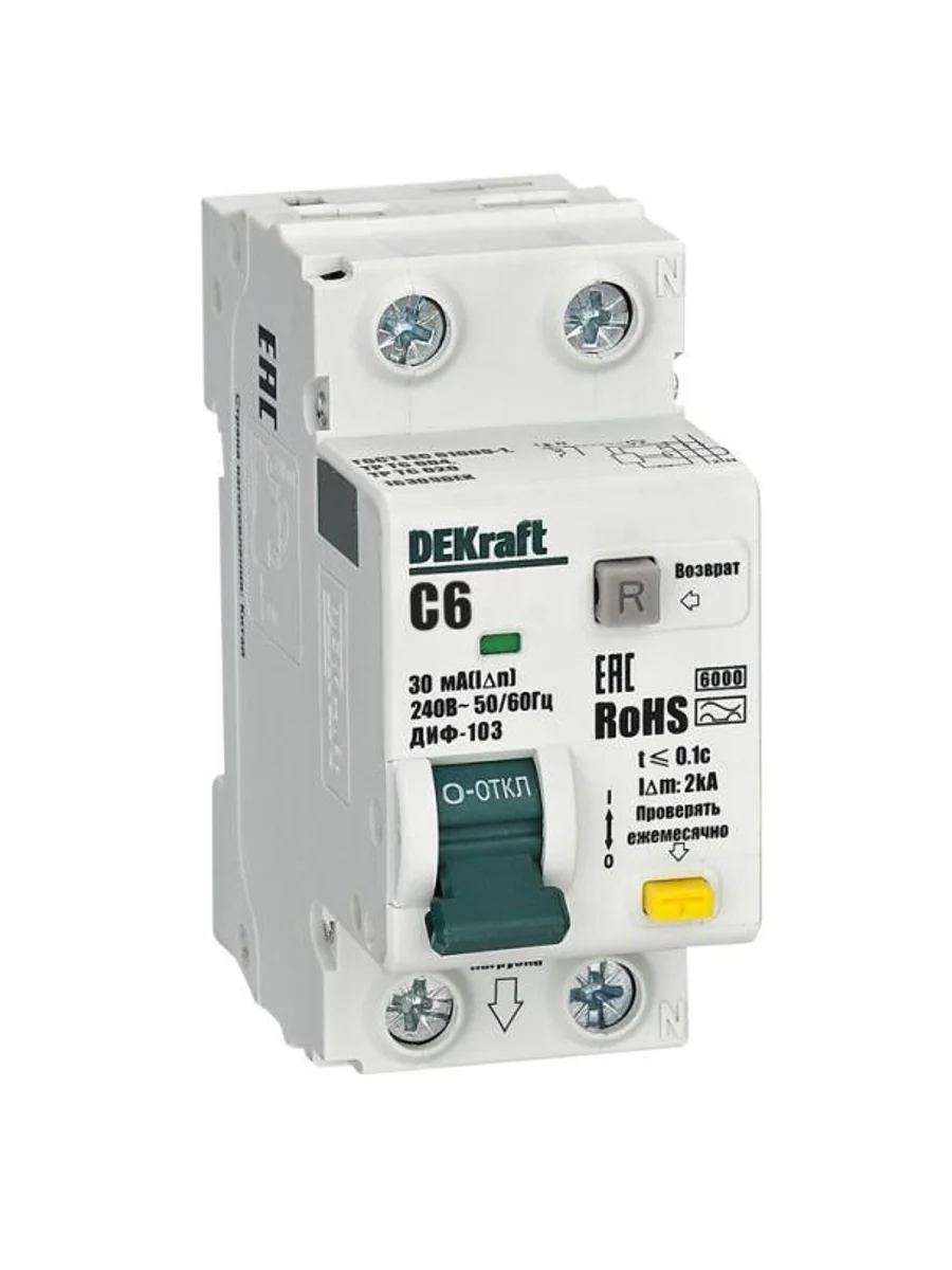 Автоматические выключатели дифференциального тока серии ДИФ-103 6кА NEW Dekraft; 1P+N; номинальный ток 6 А; ном. диф. ток 30 мА; тип диф. расцепителя - AC; кривая отключения - С; Icn, Ics = 6 кА; тип устройства - электронный; монтаж – на DIN-рейку. АВДТ обеспечивают три вида защиты — от короткого замыкания, перегрузки и возникновения утечки тока (в частности, вследствие прикосновения человека к токоведущим частям). АВДТ с отключающей способностью 6кА применяются во вводно-распределительных устройствах (ВРУ), главных распределительных щитах (ГРЩ), осветительных и распределительных установках в общественных, административных, производственных, промышленных и других подобных зданиях.