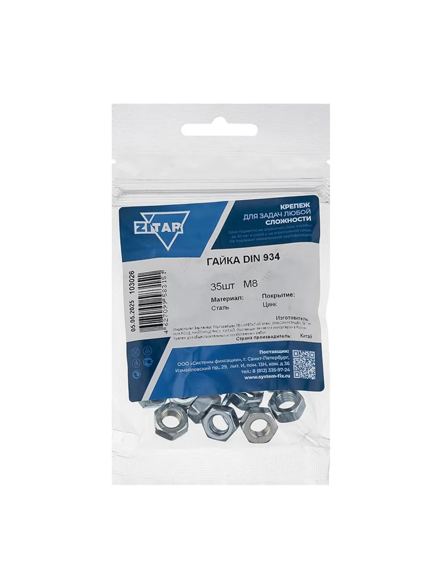 Гайка шестигранная М8 DIN934 цинк. (пакет) (уп.35шт) Tech-Krep/Zitar 103026