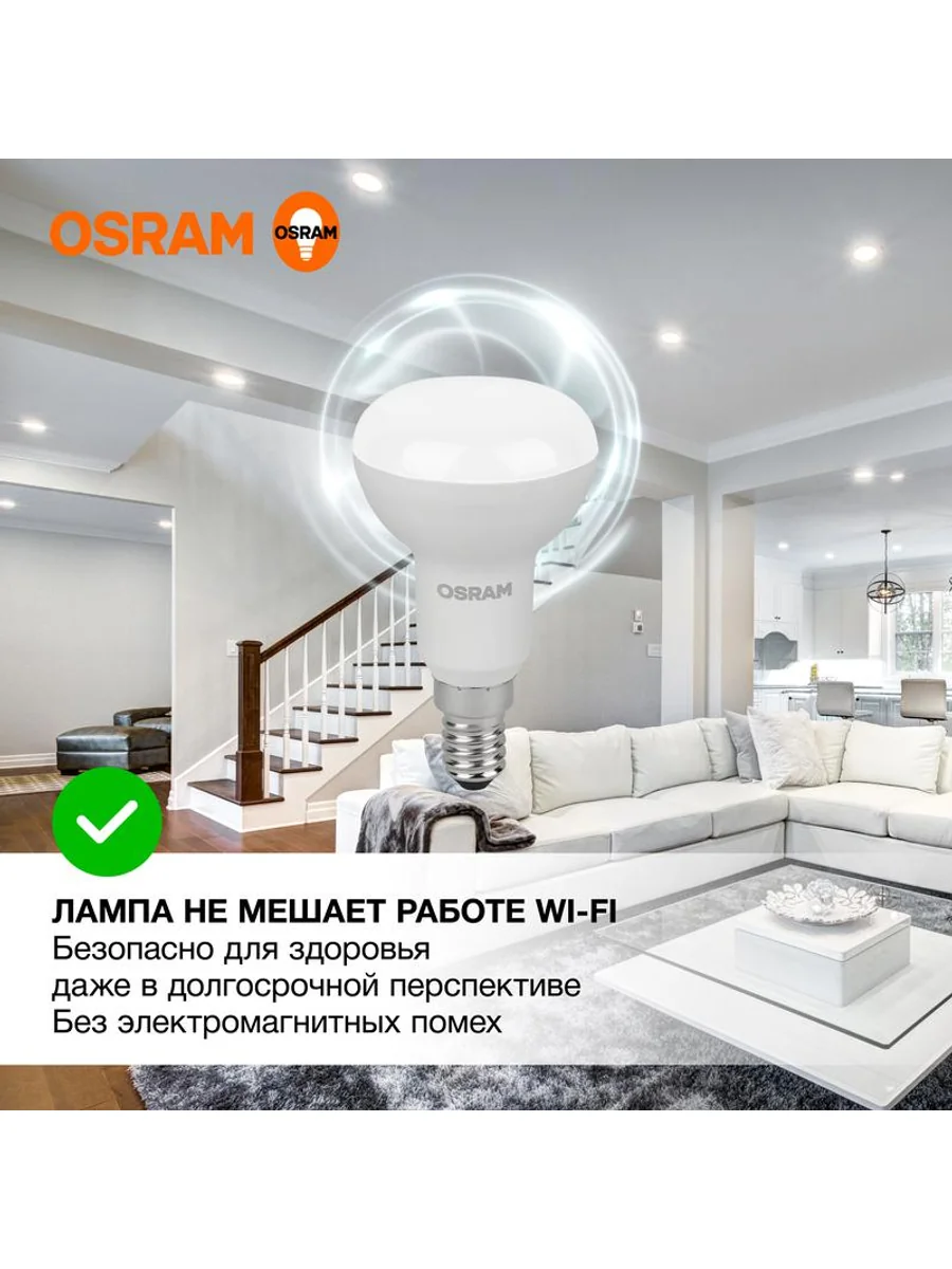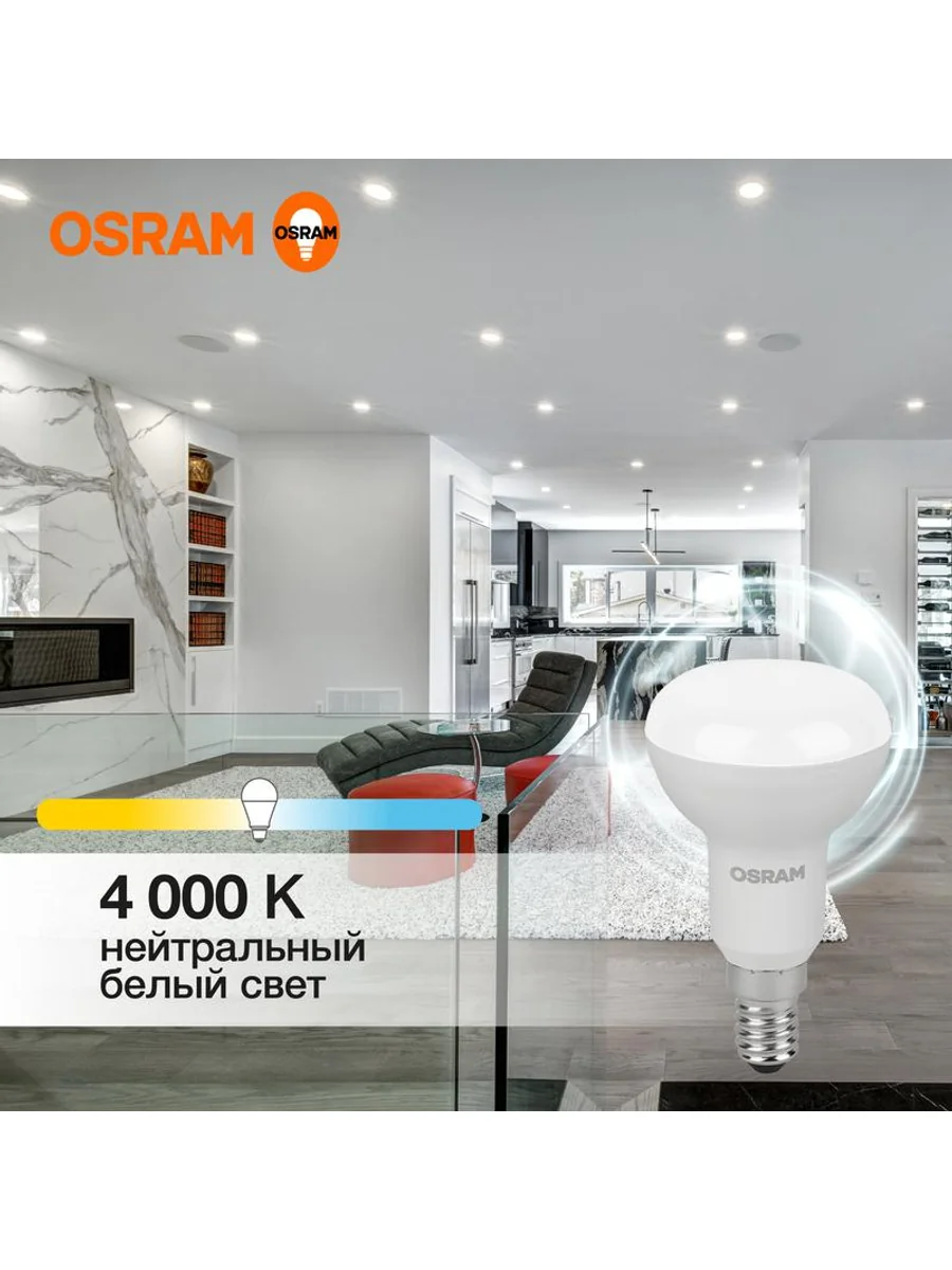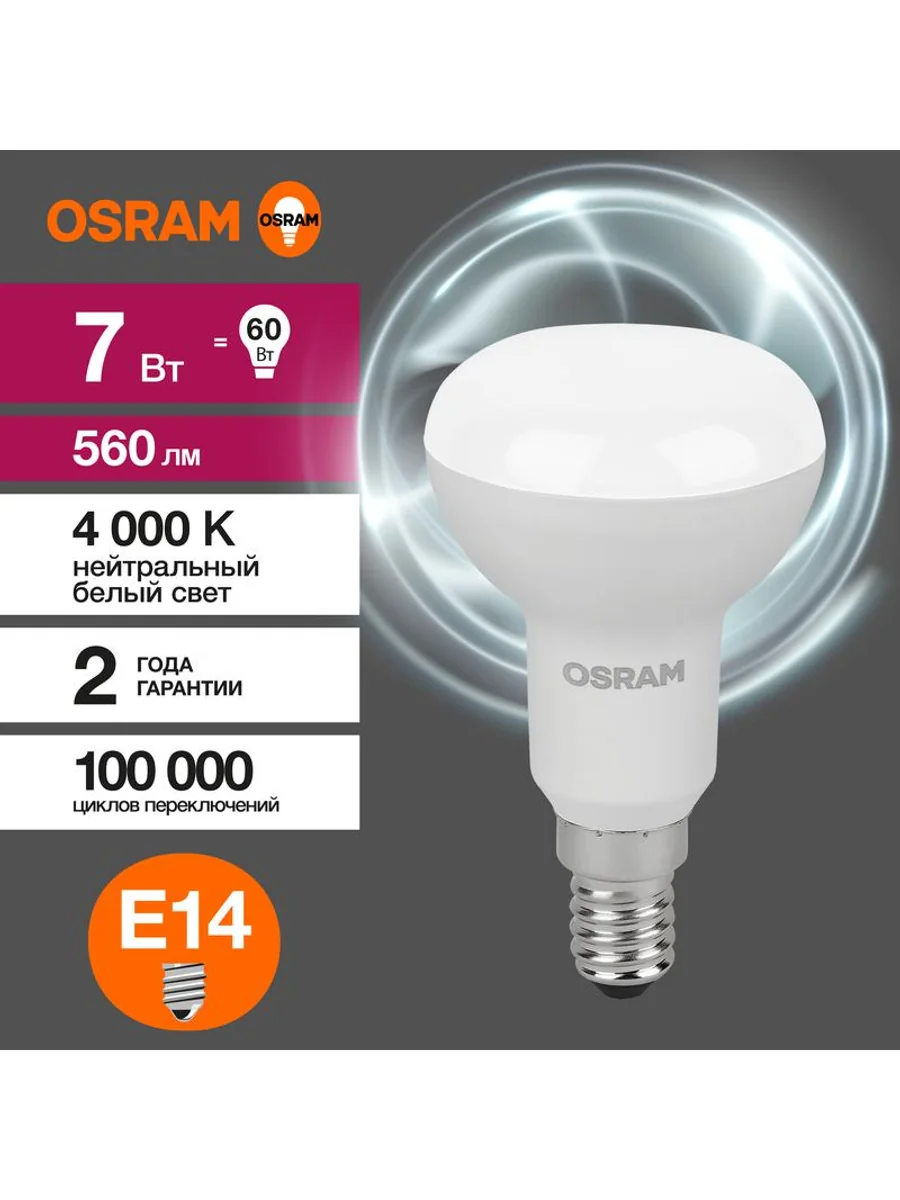 Светодиодные лампы OSRAM - разумная замена традиционным лампам накаливания или галогенным лампам. Светодиодные лампы OSRAM снижают затраты на освещение до 90% при сохранении привычного уровня освещенности. Эта лампа OSRAM серии LED Value выполнена в форме колбы R с цоколем E14. Материал колбы - пластик, исполнение - матовое. Световой поток 560 люмен, что соответствует лампе накаливания на 60 Вт. Это лампа направленного света, что зашифровано в ее названии (R - reflector, рефлектор). Такие лампы давно и успешно применяются для внутреннего освещения с помощью специальных светильников. Эта лампа излучает нейтральный белый свет, угол пучка - узкий. Качество света на высоте: низкие пульсации защищают глаза, а высокий индекс цветопередачи позволяет видеть мир в его истинном цвете. Кроме того, лампы OSRAM полностью безопасны для здоровья, поскольку в них нет опасных материалов по европейскому стандарту RoHS, а также они не производят вредных электромагнитных излучений, что подтверждено ЭМС (сертификат электромагнитной совместимости). Лампа проработает долго: срок службы - 25000 часов, 2 года гарантии. Светодиодные лампы OSRAM - умный выбор для здоровья семьи и кошелька!