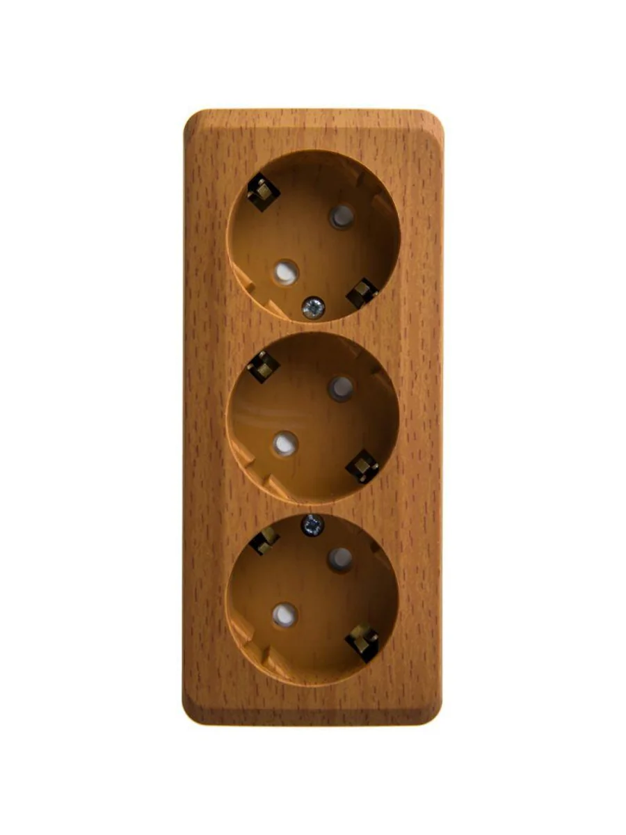 Розетка Systeme Electric (ранее Schneider Electric) ЭТЮД (бук, открытой установки) трёхместная с заземлением и шторками предназначена для применения в сетях до 250В, на ток до 16А. Трёхместная розетка позволяет подключить три устройства в одном месте. Шторки и заземление обеспечивают дополнительную безопасность при косвенных прикосновениях. Изделия цвета Бук обладают уникальным рисунком, напоминающим древесный сруб. Сделано в России.