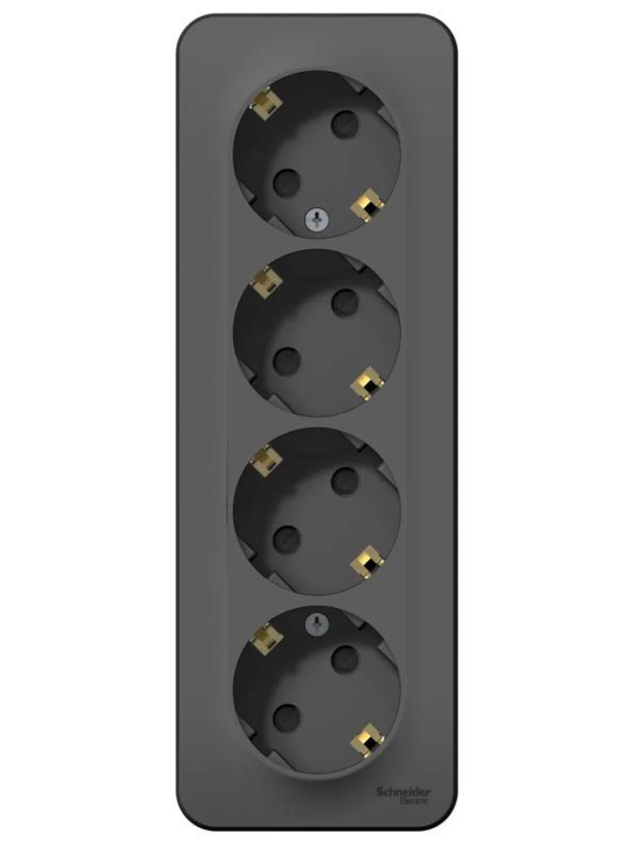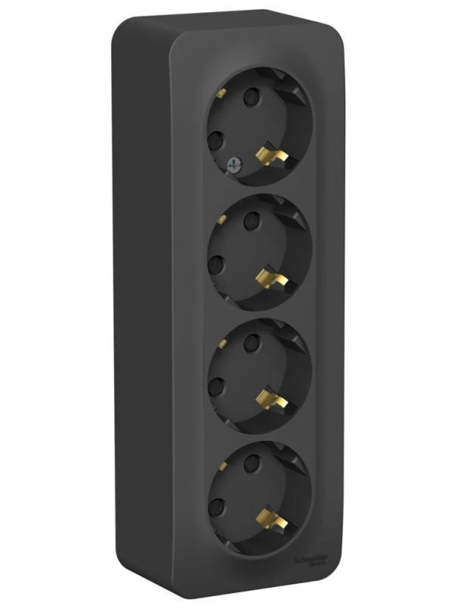 Розетка Systeme Electric (ранее Schneider Electric) BLANCA (антрацит, открытой установки) четырехместная, с заземлением, шторками и изолирующей пластиной предназначена для сетей до 250В, на ток до 16А. Четырехместная розетка позволяет подключить четыре устройства в одном месте. Шторки и заземление обеспечивают дополнительную безопасность. Она изготовлена из ABS-пластика, проста в установке и удобна в применении.